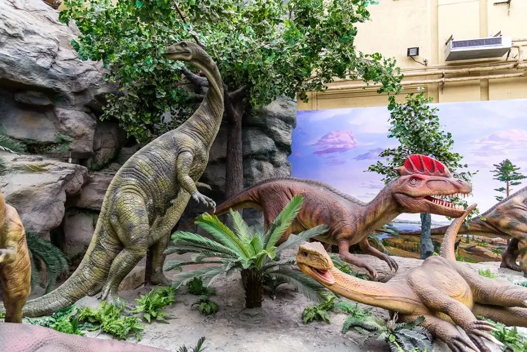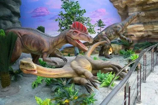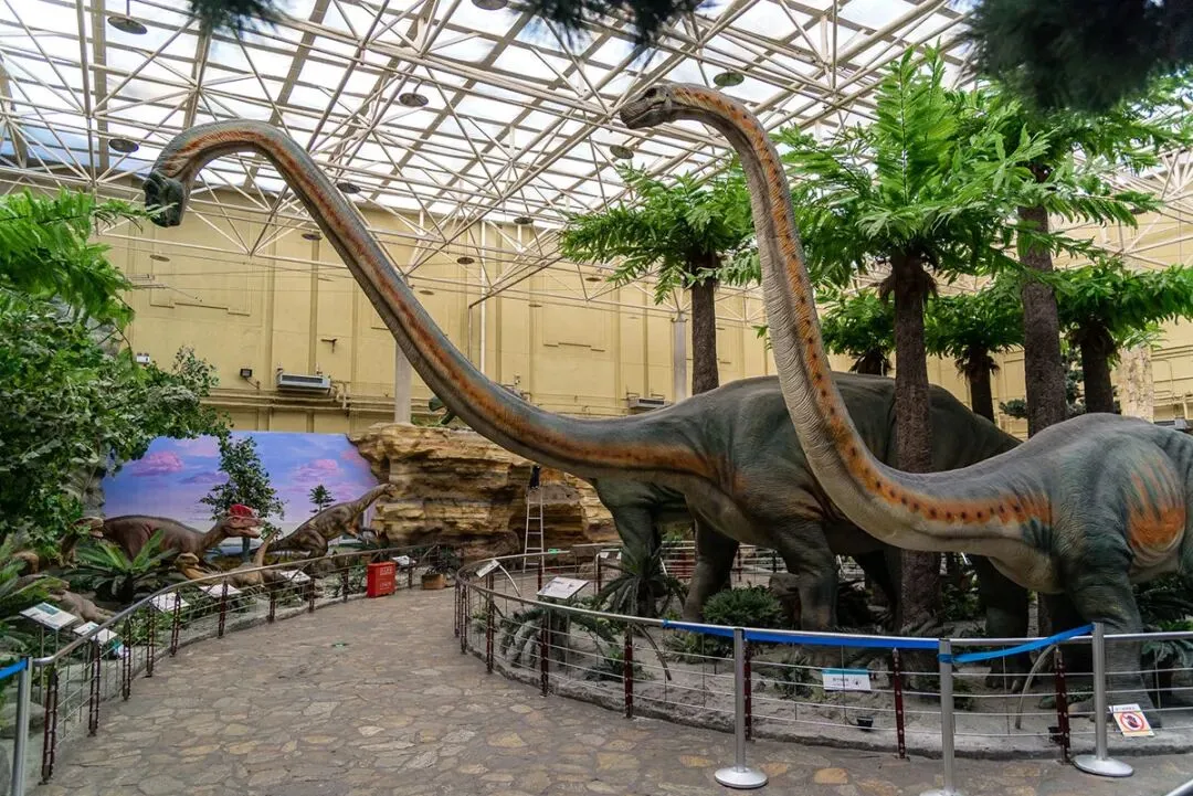 在《恐龙公园》中观众可亲眼目睹庞大的峨眉龙躲在树林中,高抬着长长的脖子,够吃蕨类植物树顶端的嫩枝;一只小小的盐都龙,受到了食肉恐龙的威胁,钻到峨眉龙的肚子底下躲避危险;尽管地面危机四伏,天空上的翼龙悠闲地在空中滑翔;马门溪龙动着蟒蛇一样的脖子,极力想发出叫声,无奈它的脖子太长,就像今日长颈鹿一样,是个哑巴;更有凶猛的永川龙虎视眈眈地盯着巨大峨眉龙,伺机把它们作为美食;两只恐爪龙合力围攻一只甲龙,甲龙凭借身上的重甲,对贪婪的恐爪龙不理不睬。这里需要提醒一下身高1.7米以上的观众,参观的时候要当心,蜀龙带刺的尾锤在四处摇摆,不小心就会被这凶猛的武器砸到脑袋。