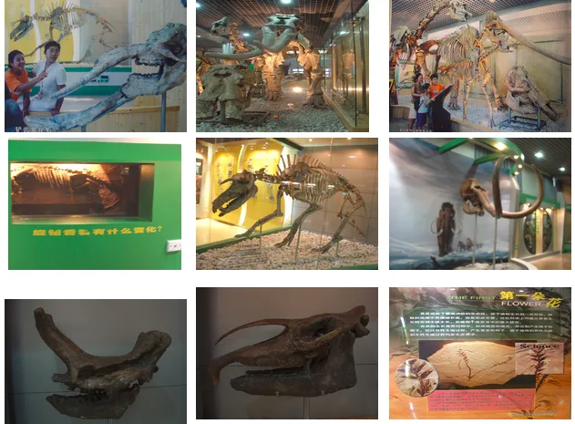 在展厅中,观众可以看到阶齿兽的复原图和骨骼标本,它是恐龙绝灭后地球上同期最大的哺乳动物;可以欣赏到庞大的象类家族,包括赫赫有名的高4米长8米的黄河象和铲齿象。观众还可以欣赏到一件十分引人注目的标本,最早的被子植物化石——世界上第一朵花辽宁古果。