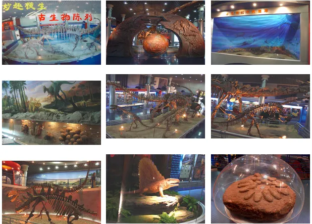 大厅中央展示了栩栩如生的恐龙骨架群,如中国人发现的第一条恐龙——许氏禄丰龙,体长达26米的井研马门溪龙,称王称霸的霸王龙,小巧玲珑的恐爪龙,背上布满剑板的沱江龙,威风凛凛的永川龙,展翅翱翔的翼龙,称霸海洋的鱼龙。