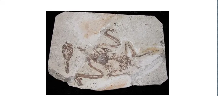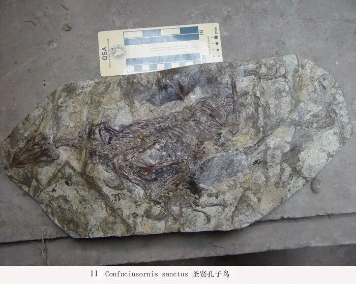 孔子鸟(Confuciusornis):孔子鸟是在辽宁发现的中生代鸟类形态最原始的类型之一,在分类学中属于基干鸟类。口中牙齿已退化消失,角质喙出现,是世界上已知最早有角质喙的鸟类。此外,它的原始性还表现于前肢翅膀上的利爪相当发达,孔子鸟的飞行能力要比始祖鸟强,它的后肢已经能适应攀援树木。孔子鸟的尾椎已愈合为一根尾综骨。