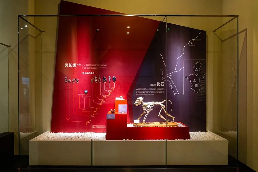 新布展改造的《古哺乳动物》大型专题展览整体色调采用了米黄色系,选用该色系是源于古哺乳动物化石原始埋藏地层中岩石的颜色。展览入口处序厅的主题展标的设计理念选择了新生代具有代表性的剑齿虎捕食大唇犀的造型,通过骨架的形式再现了古哺乳动物繁盛时期的典型生活场景。展览中采用斗折曲线渐至开放式的场景,通过古哺乳动物的时代演化作为展示顺序,还依据中生代小型哺乳动物化石证据,通过3D打印技术复原了馆藏的9种小型古哺乳动物的圆雕模型,同时,辅以互动滑屏多媒体表现形式,使板状的模式标本更加直观、立体呈现出来,帮助观众更深刻认识和了解展陈,享受更好的参观体验。