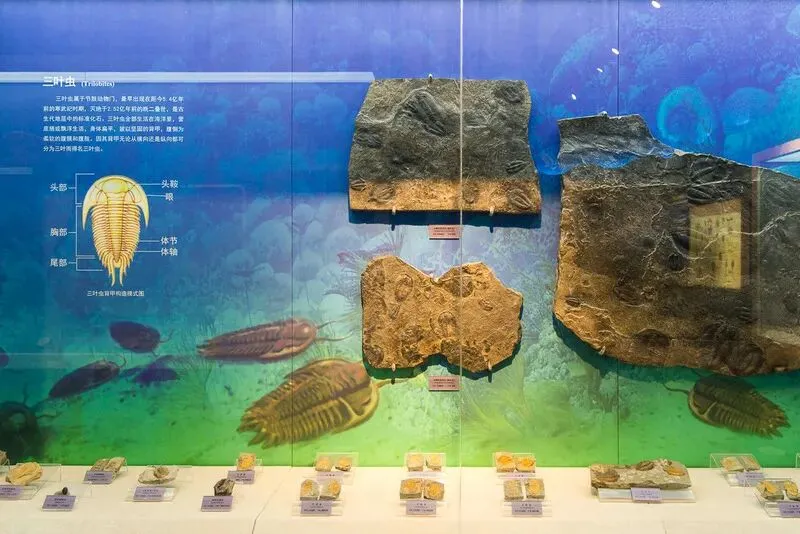 展厅展示了一亿多年前地球上的繁荣景象,详尽讲述了古无脊椎动物兴盛衰亡的发展历史。大量热河生物群的古生物化石、特别是辽宁西部的带毛恐龙化石都会引起观众的浓厚兴趣。