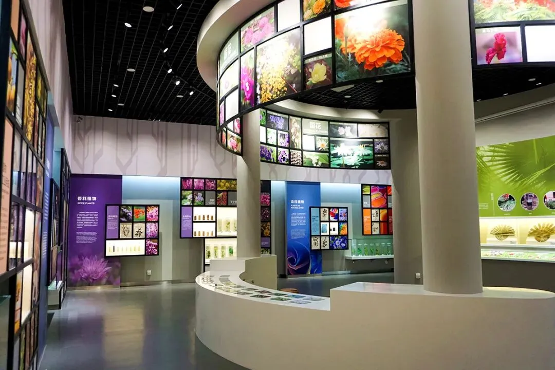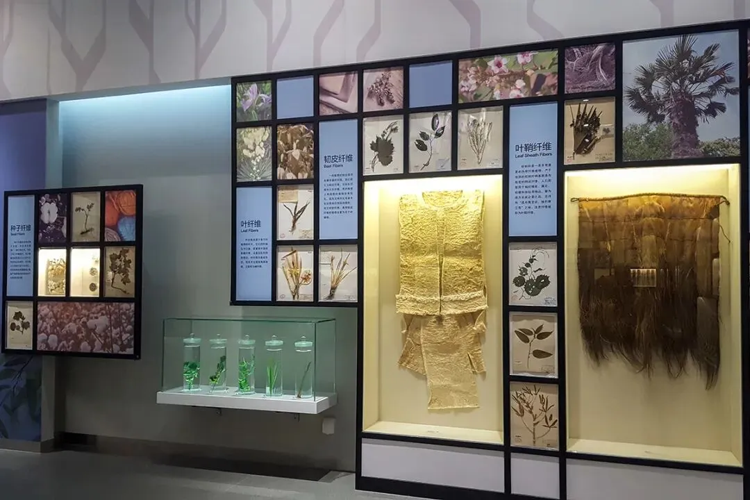 植物与人类展厅分为两个部分,外围墙面是第一部分,展示与人们的物质文明相关的植物内容,包括食用植物、药用植物、油料植物、纤维植物、香料植物、染料植物和其他具有重要经济价值植物共七个单元。展厅中央区域是本展厅的第二部分,展示了五十多个国家的国花,还展示了我国云南西双版纳地区傣族的贝叶经实物。