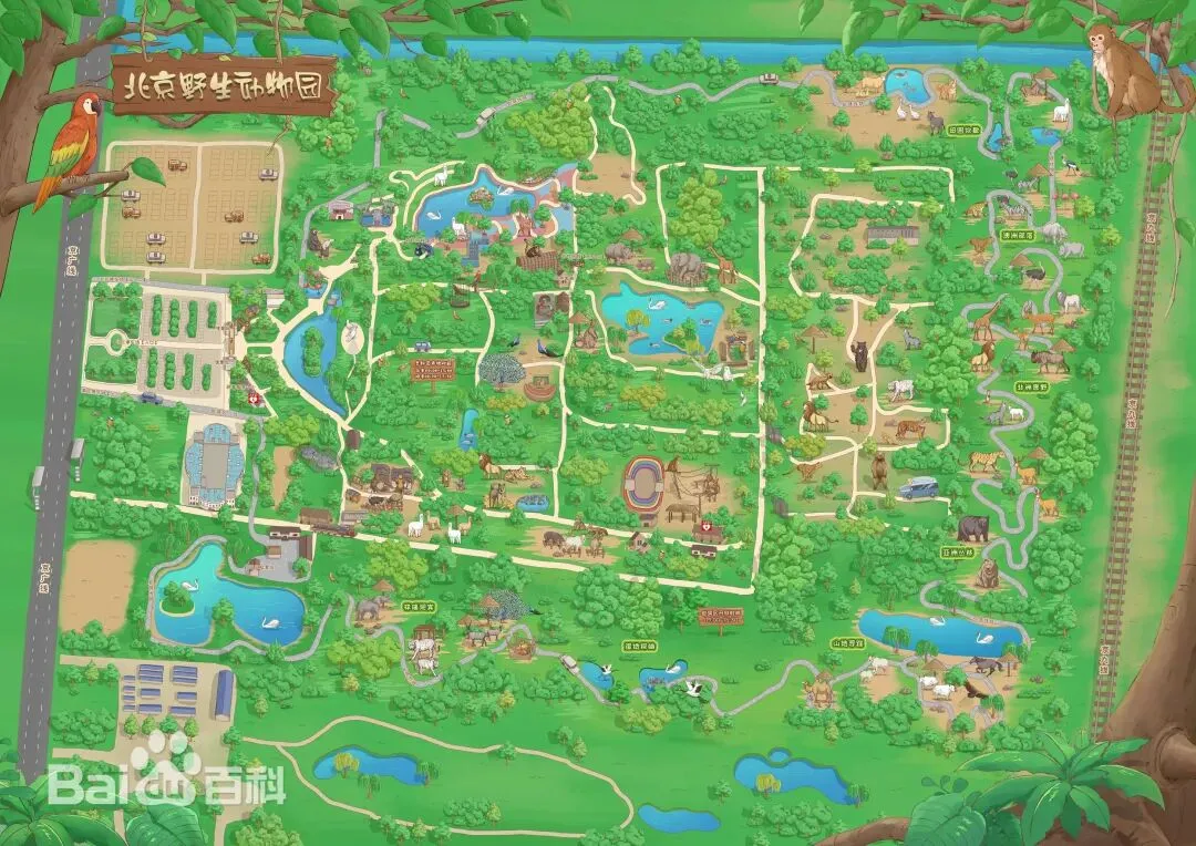 北京野生动物园自驾游览区占地面积1200亩,游览线路全程11千米,共有七大动物展区,设置了37个参观场景,展示62种、828头(只)野生动物;除了自驾,游客还可乘坐园内的“小火车”进行游览,“小火车”候车区采用传统四合院的建筑格局,每处院落冠以有代表性的老北京地名,同时展出相关动物,例如“虎坊桥”上能看虎、“鲜鱼口”里有鲜鱼、“豹房胡同”藏薮猫。