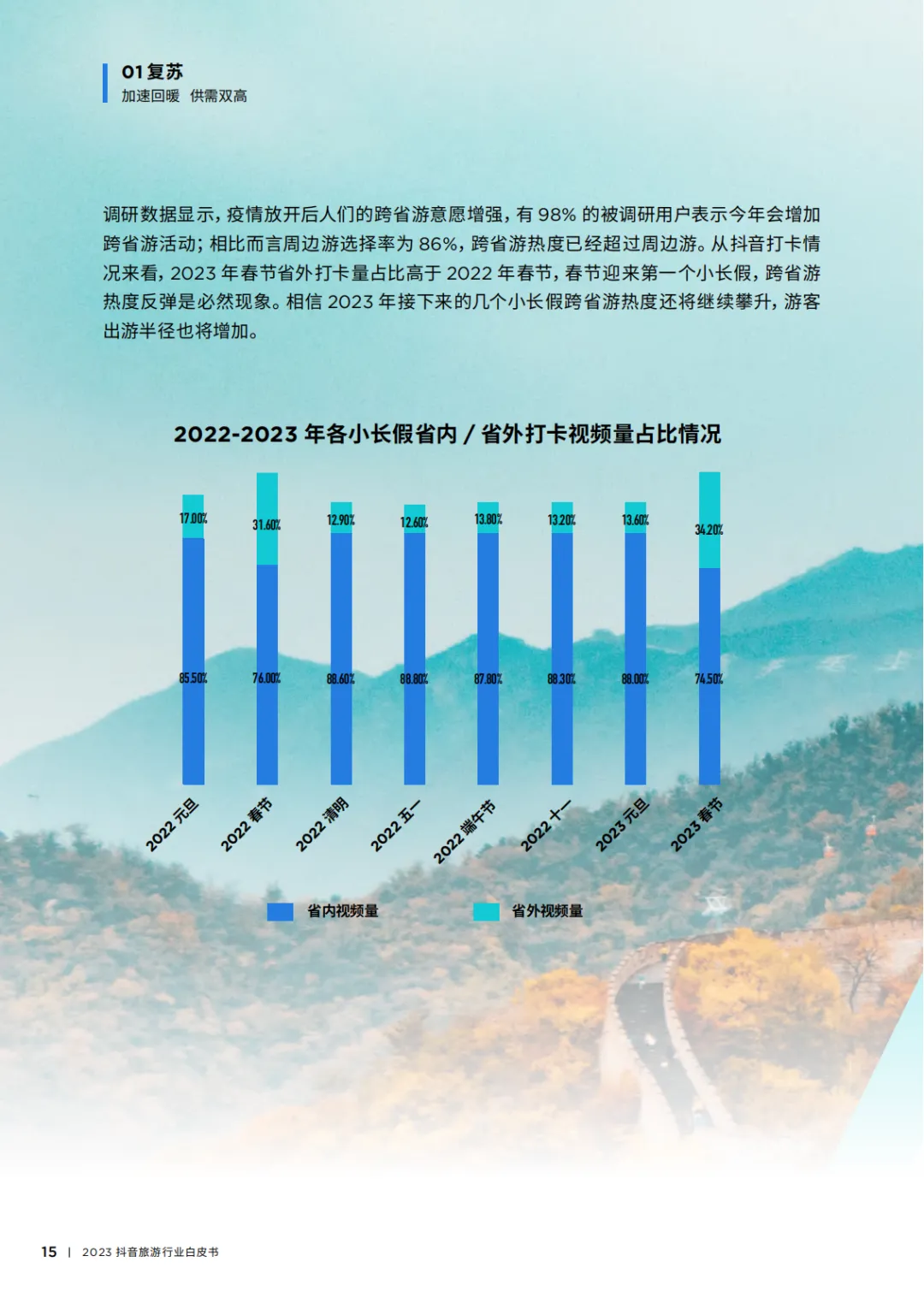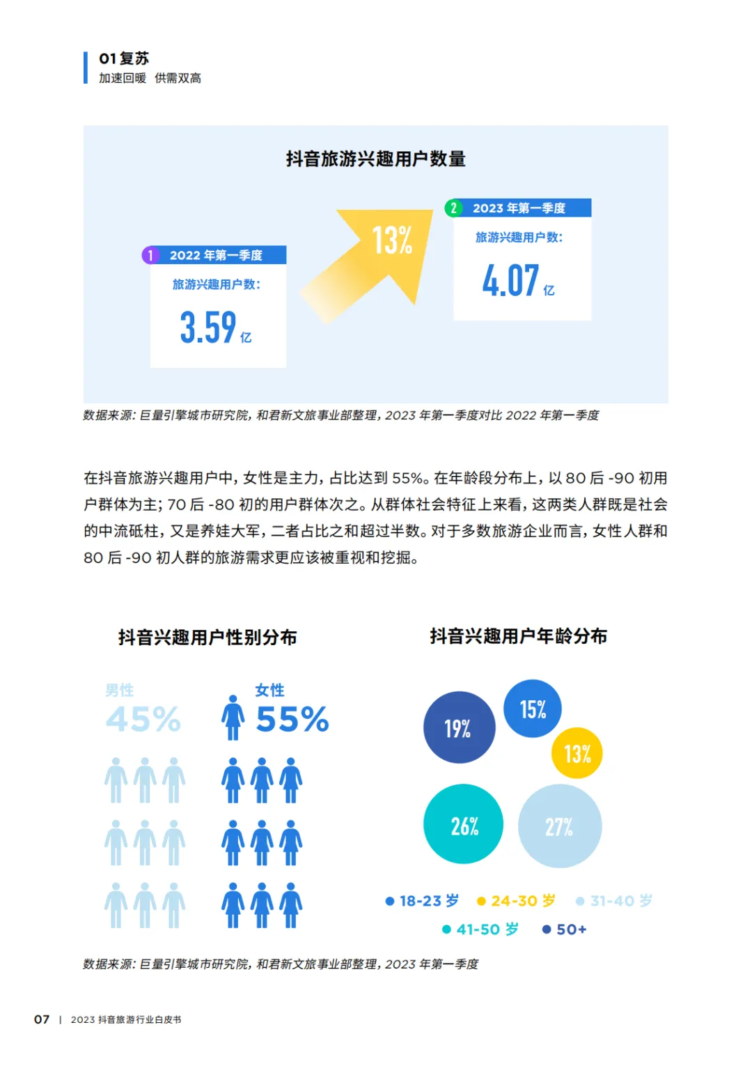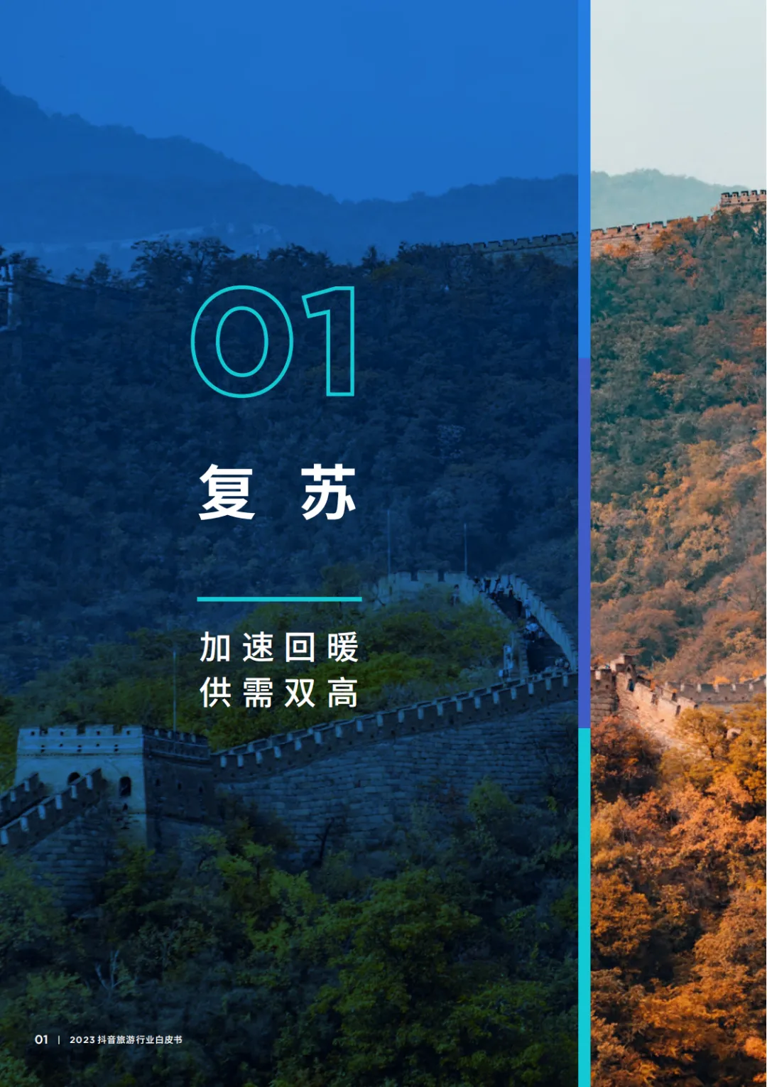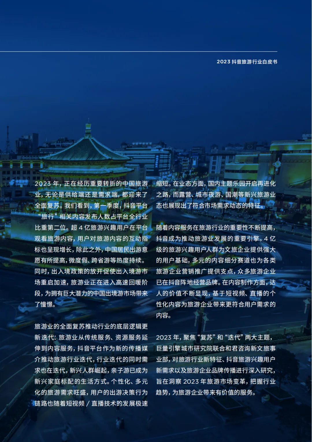 2023年,正在经历重要转折的中国旅游业,无论是供给端还是需求端,都迎来了全面复苏。我们看到,第一季度,抖音平台“旅行”相关内容发布人数占平台全行业比重第二位。超4亿旅游兴趣用户在平台观看旅游内容,用户对旅游内容的互动指标也呈现增长,除此之外,中国居民出游意愿有所提高,微度假、跨省游等热度持续。同时,出入境政策的放开促使出入境游市场重启加速,旅游业正在进入高速回暖阶段,为拥有巨大潜力的中国出境游市场带来了憧憬。