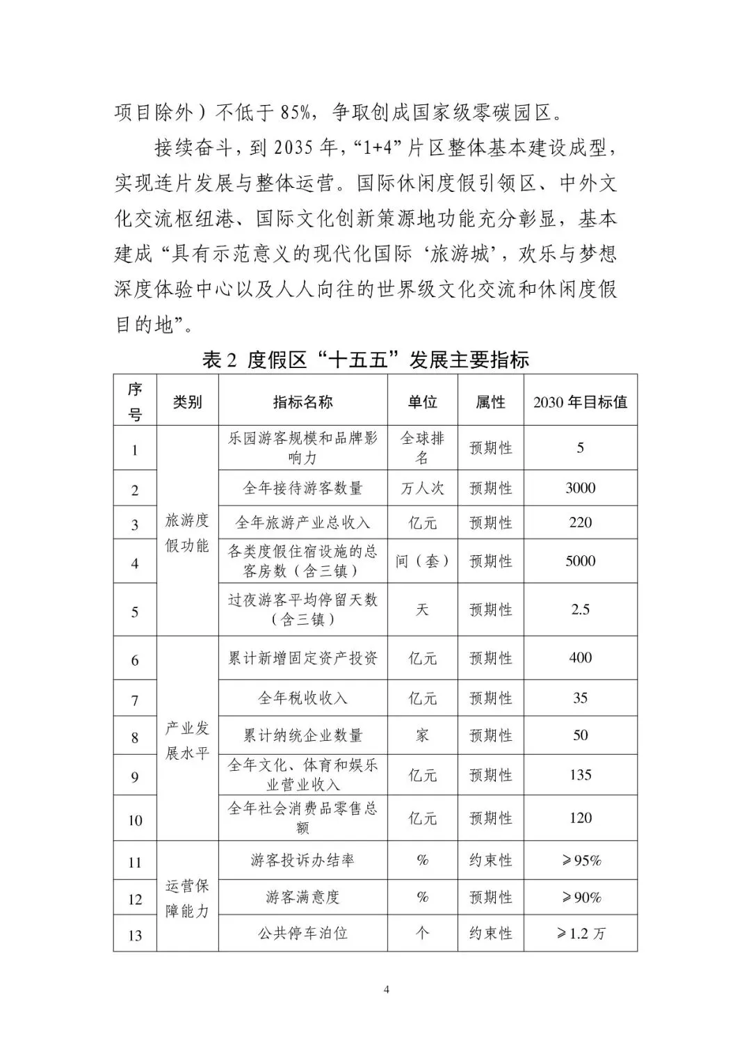 到 2030 年,度假区游客投诉办结率不低于 95%,游客满意度保持在 90%以上。公共停车泊位不少于 1.2 万个,二星级及以上绿色建筑比例(乐园项目除外)不低于 85%,争取创成国家级零碳园区。