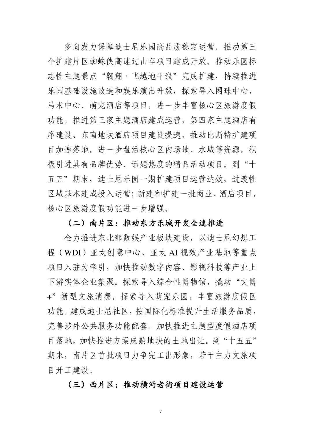 全力推进东北部数娱产业板块建设,以迪士尼幻想工程(WDI)亚太创意中心、亚太 AI 视效产业基地等重点项目入驻为牵引,加快推动数字内容、影视科技等产业上下游实体企业集聚。探索导入综合性博物馆,撬动“文博+”新型文旅消费。探索导入萌宠乐园,丰富旅游度假区功能。建成迪士尼社区,按国际化标准提升生活服务品质,完善涉外公共服务功能配套。加快推进主题型度假酒店项目落地,加快推进方案成熟地块的土地出让。到“十五五”期末,南片区首批项目力争完工出形象,若干主力文旅项目开工建设。