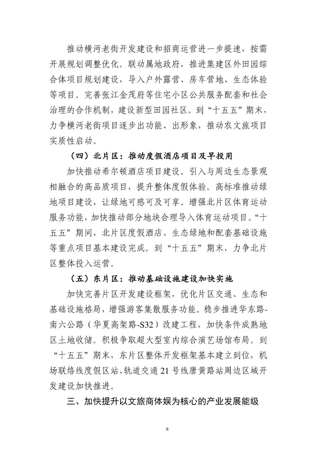 加快完善片区开发建设框架,优化片区交通、生态和基础设施格局,增强游客集散服务功能。稳步推进华东路-南六公路(华夏高架路-S32)改建工程,加快条件成熟地区土地收储。积极争取超大型室内综合演艺场馆布局。到“十五五”期末,东片区整体开发框架基本建立到位,机场联络线度假区站、轨道交通 21 号线唐黄路站周边区域开发建设加快推进。