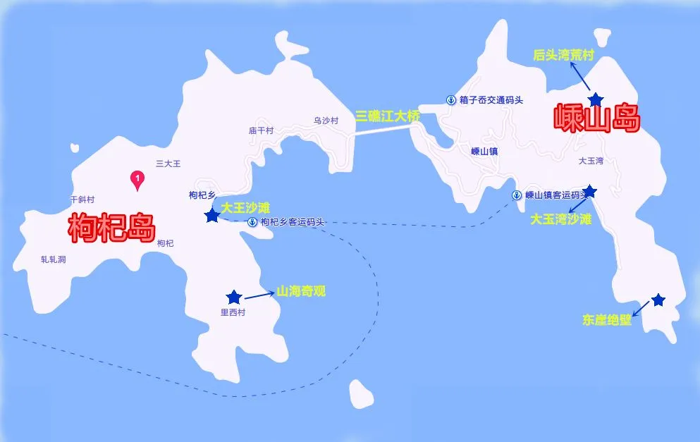 枸杞岛和嵊山岛通过一座大桥相连, 枸杞岛玩一天嵊山岛玩一天刚刚好。