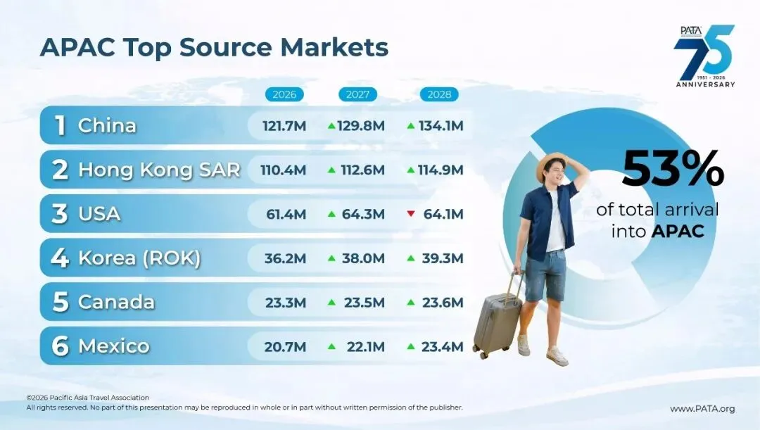 据亚太旅游协会(PATA)发布的《亚太游客预测2026–2028》报告显示,至2028年,亚太地区国际游客到访量预计将在6亿至9.18亿之间;增长动能来自关键市场经济回暖、出行需求释放、签证便利化推进、跨境合作强化,以及数字化技术持续重塑旅游体验。