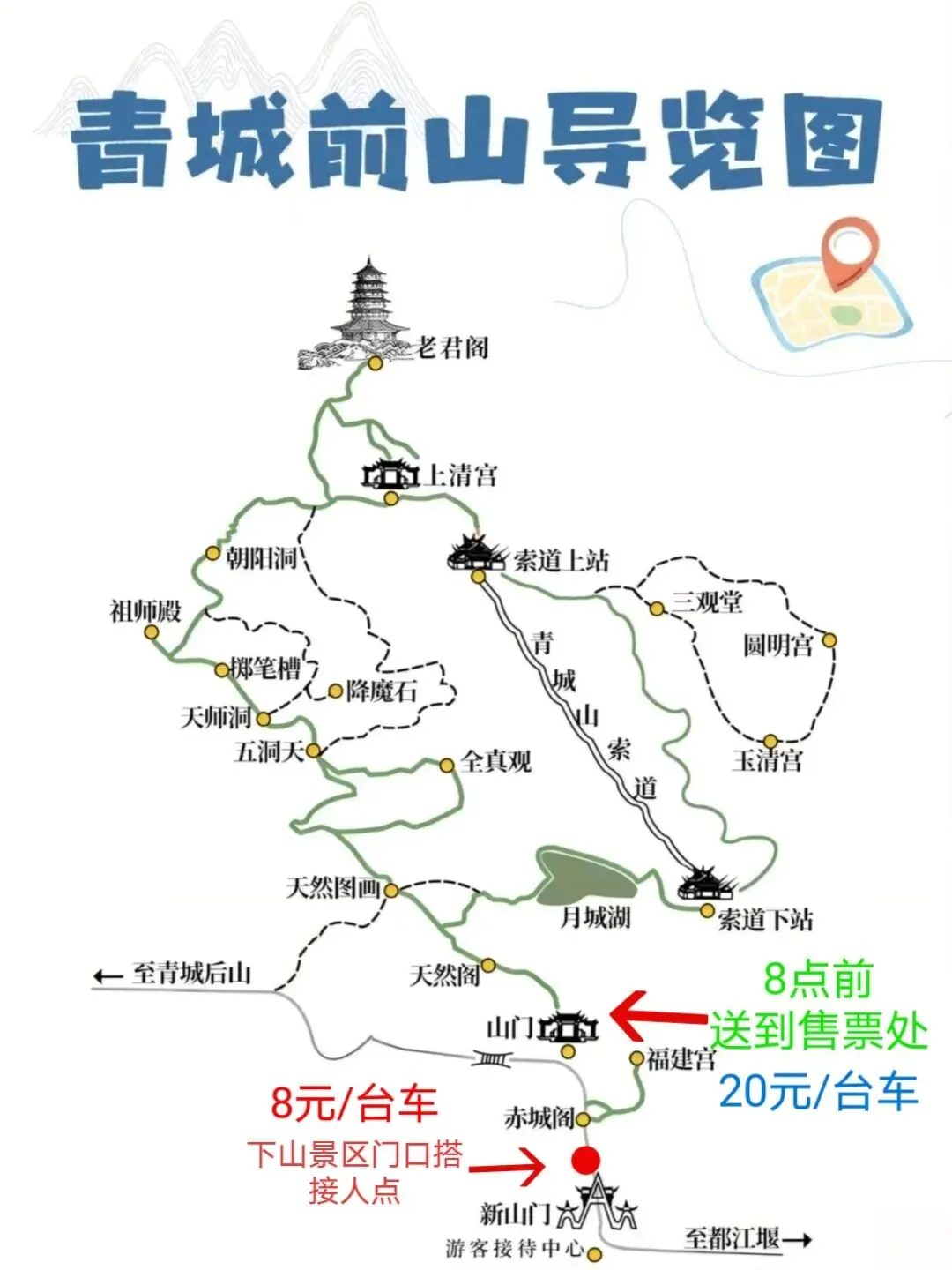 2.如果你从大观园这边民宿要去爬青城山,同样也是可以打车,在早上8:00之前可以直接到达青城山的售票处,也是建福宫附近。在大观园这一带打车过去也就15块钱左右。如果是坐三轮车,可能送到建福宫就要20元。