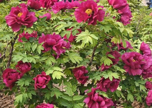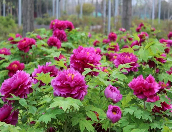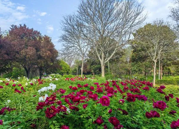 其中盛开的牡丹品种有:洛阳红、蓝月亮等;