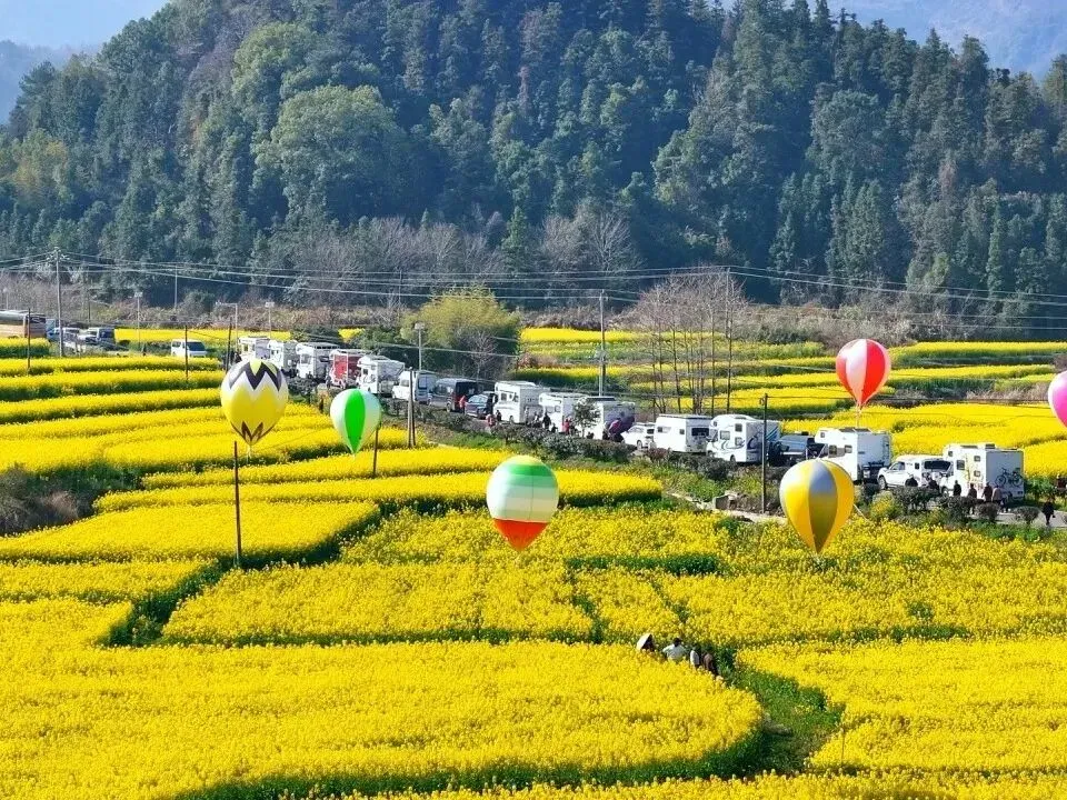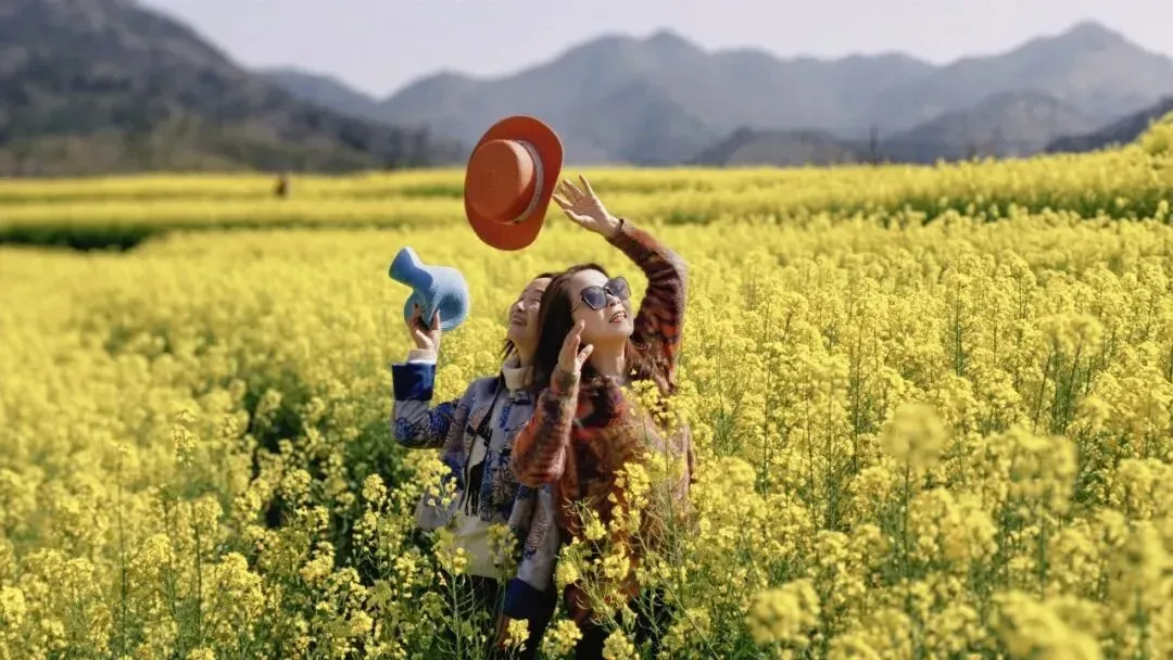 油菜花田:漫步近万亩金色花海田间步道,与青山、白墙古村同框拍照,打卡草垛、天空之城等网红装置,风过花浪时拍全景,出片率极高。