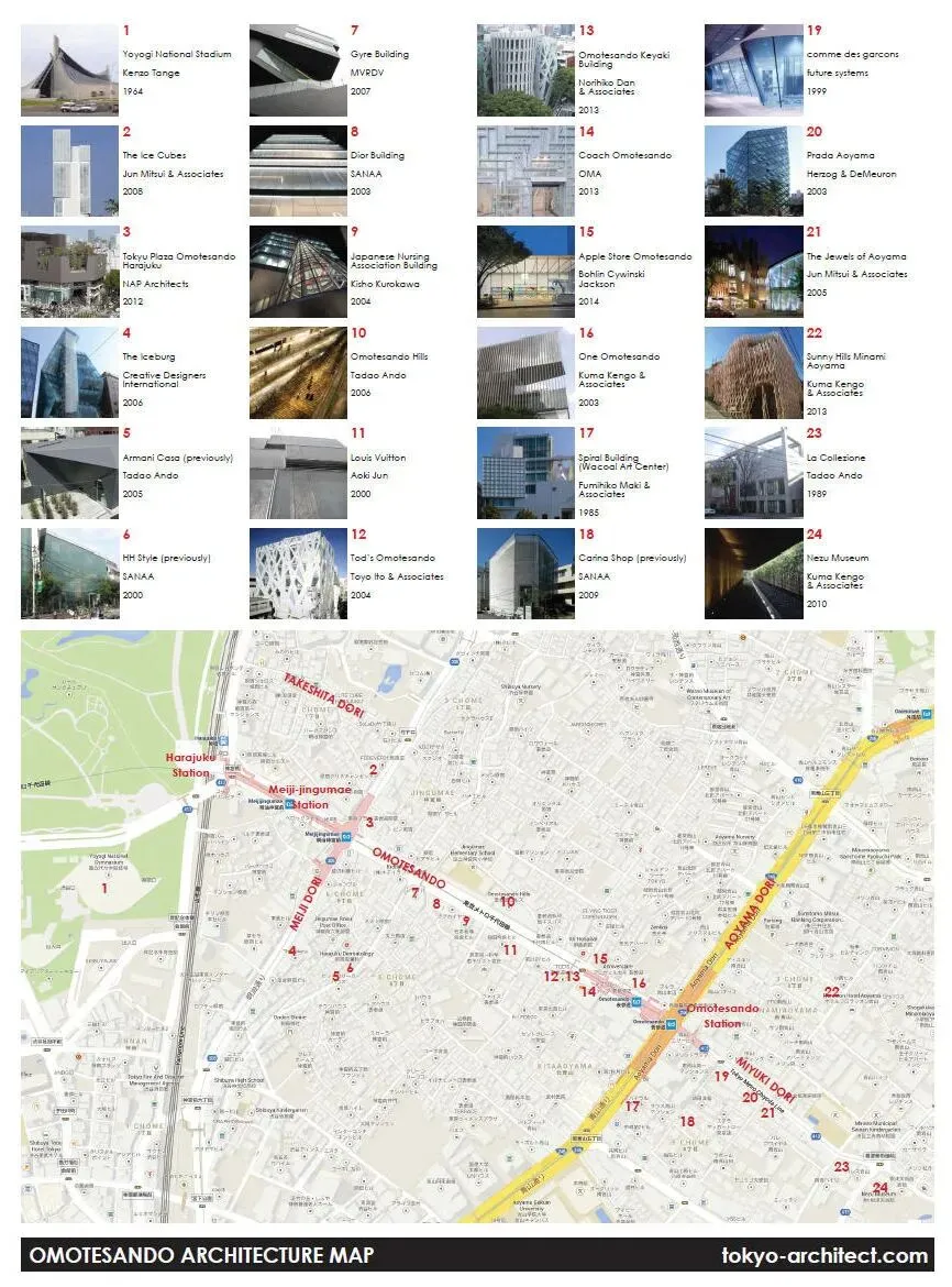 ▲表参道不仅是东京的香榭丽舍大街,还是建筑师作品的露天展览。短短几公里的街道上,可以看到安藤忠雄、隈研吾、伊东丰雄、丹下健三、青木淳等知名建筑师的作品。(图源:Tokyo Architect)