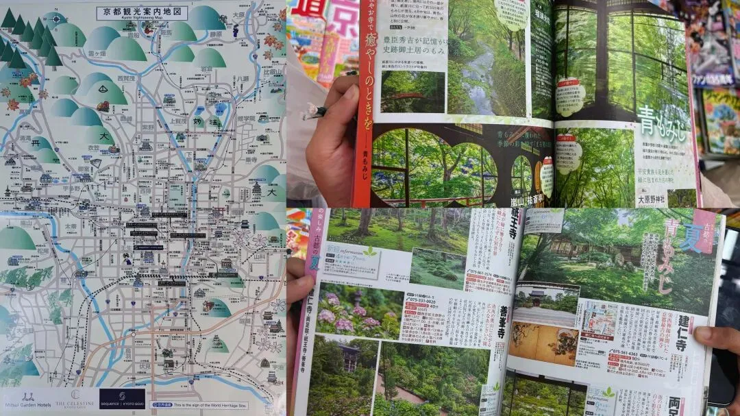 ▲从我们的酒店前台要了一张非常棒的地图。京都有太多太多的世界遗产和名胜景点,天女散花一样遍布整座城市,选择困难症要犯了。直到快离开京都的时候,我们后知后觉去逛了书店,反思为什么不早点买一本旅游的书,可以看图文并茂的、详细地道的游览指南。半蒙半猜读日文,不求甚解。