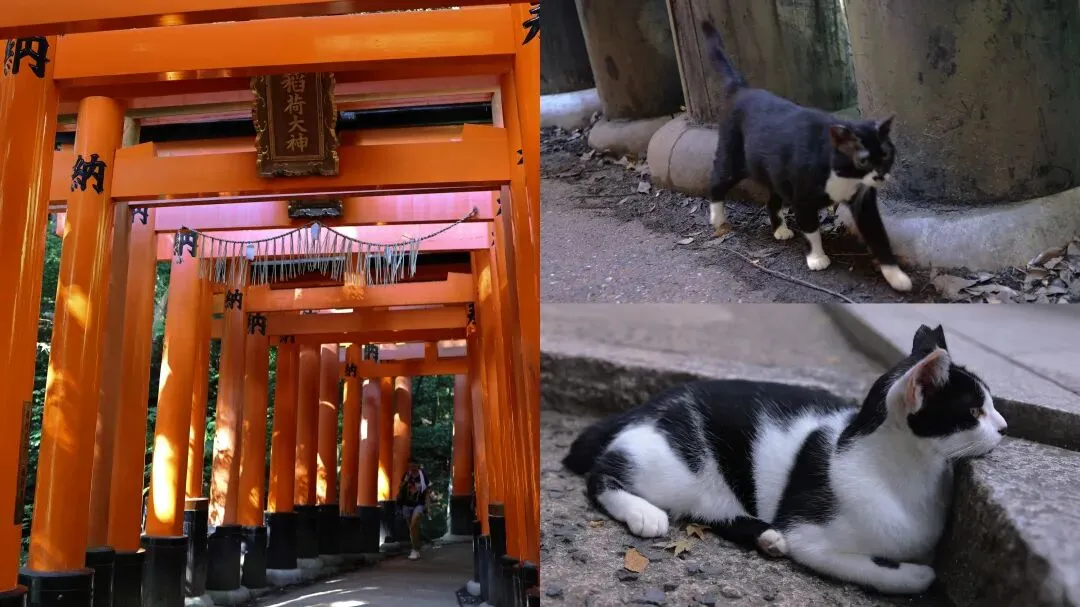 ▲鸟居起源古老而复杂,它的外形类似牌坊,在日本代表神域的入口,区分(也有说是联结)神栖息的神域和人类居住的世俗界。稻荷山大约233米高,缺乏体育锻炼的游客来爬山,必定是一路买买买水续命。在千本鸟居没有看到狐狸使者,倒是遇到霸气淡定的猫猫。