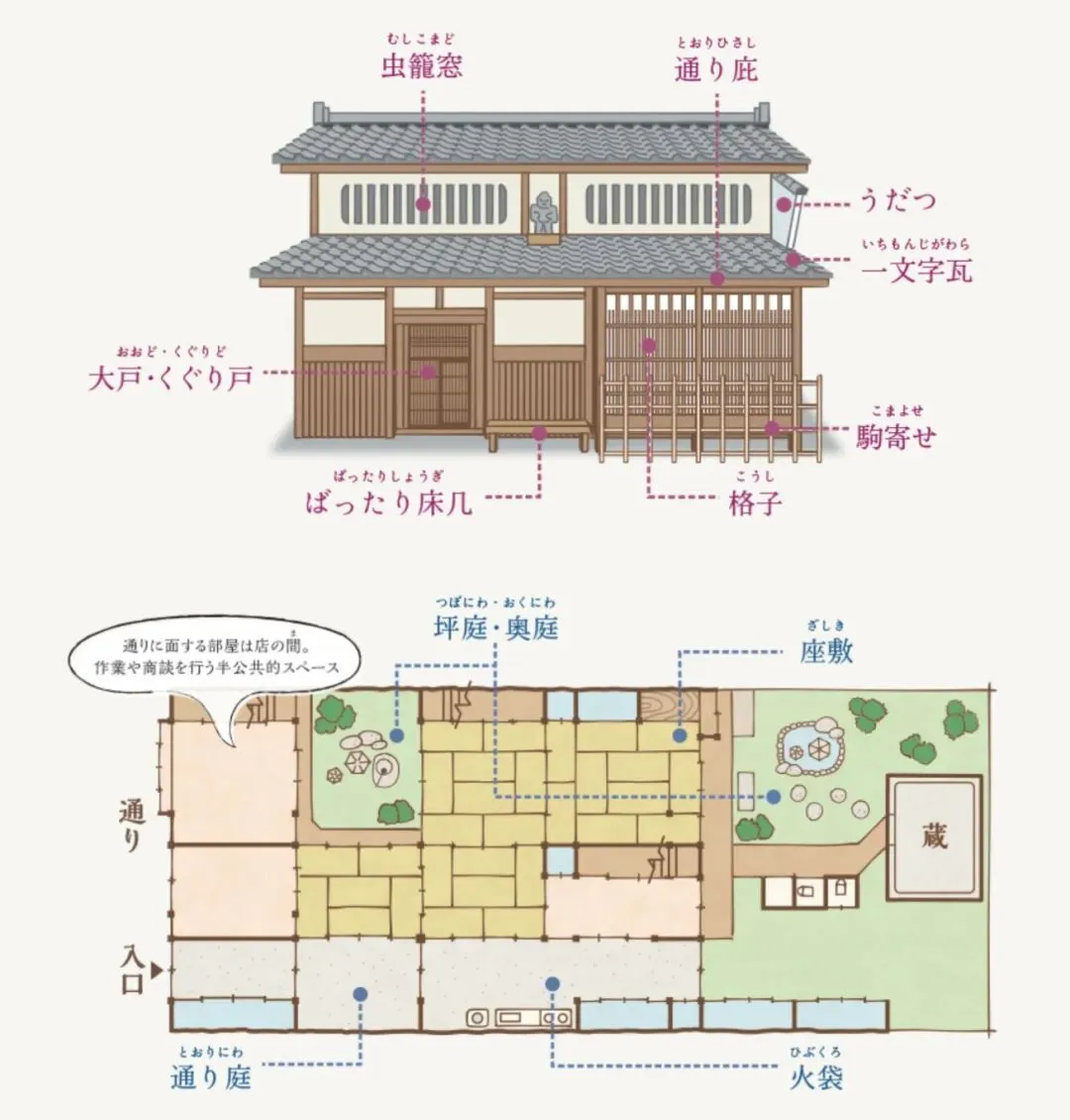 ▲町屋始于17世纪,是木质构造的传统连体式建筑,曾经的屋主是商人或者手工艺人,多采用上层居住、下层临街开店的模式。在1950年之前,依据传统木造轴组构法建造的木造家屋,被称作京町家。京町家承载了京都的茶道、和服、工艺和市民文化,经历新时代的再生改造,散发新的魅力,很多国际化品牌选择在京町家开精品店,有三宅一生、香奈儿、LE LABO、LEICA GALLERY、新风馆等。旧即是新,传统的即是摩登的。(图源:京都市文化财产保护科)
