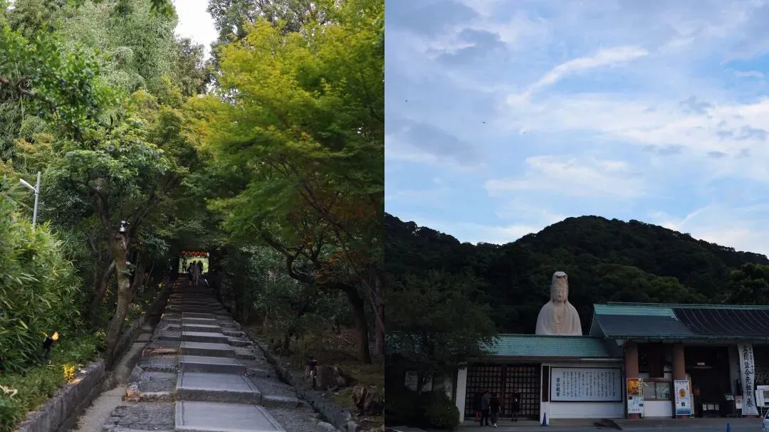 ▲高台寺(左)是丰臣秀吉的遗孀为纪念丈夫而建造的,丰臣秀吉的继任者德川家康也参与协助。在日暮时分,灵山观音像(右)看上去非常安宁祥和。这个景点有点亏,因为不需要买门票,就可以从墙外看到观音。