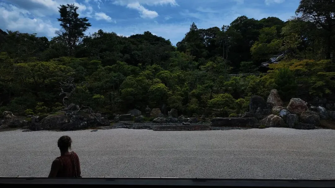 ▲坐在茶室的瀑布前,喝一碗齁苦的抹茶,吃一块齁甜的点心,休息静思片刻,开始参观方丈庭园。庭园建筑物各个房间共有124幅精美的壁画。庭园里有多处日式传统枯山水,相传此地的枯山水庭园是由精通茶道、建筑、园林、陶瓷和文学创作的艺术家小堀远州打造的。