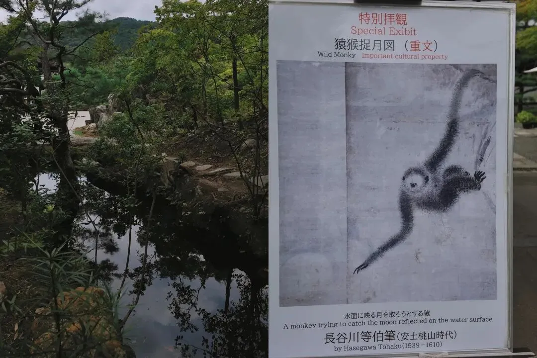 ▲相比之下,金地院里的其他庭园显得过于朴实了。鹤龟之庭的建筑物里展出了多幅艺术作品,我们觉得最有生趣的是一幅猴子捞月的画作。