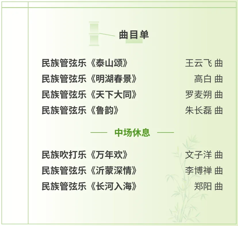《泰山颂》以雄浑笔触勾勒岱岳之势,《明湖春景》撷取泉城灵动之气,《天下大同》贯通古今气象,《鲁韵》凝练儒风雅韵,《万年欢》以吹打之姿点燃民间欢腾,《沂蒙深情》以质朴旋律致敬红色沃土,《长河入海》则将黄河奔涌与海天交汇的壮阔尽收笔下。