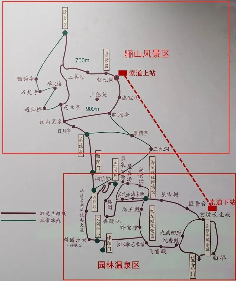 津阳门(东门)-莲花汤-海棠汤-星辰汤-尚食汤-禹王殿-珍宝馆-长恨歌艺术馆-飞霜殿-沉香殿-九曲回廊-玄境长生殿-索道下站-索道上站-老母殿-朝元阁-上善湖-烽火台-芝兰亭-日月亭-兵谏亭-昭阳门(西安事变演出)-开阳门-桐梓轩-五间厅-环园-香凝池-梨园乐坊(按歌台)-长恨歌演出(珍宝馆附近)-望京门(西门)