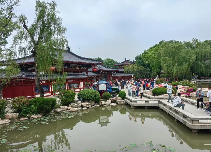 景区的标志性景观,湖畔环绕着飞霜殿、宜春殿、沉香殿、龙石舫、龙吟榭、九曲回廊等仿唐建筑群,整体布局属于典型的北方皇家园林风格。