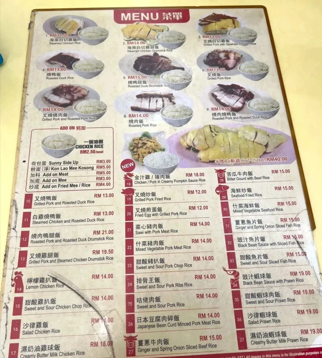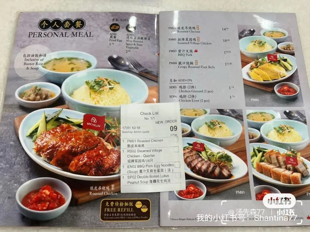 点了招牌的海南鸡饭和吊烧鸡都挺不错的,莲藕花生炖汤也很香!价格也很美丽🤩,三个人大概70多马!