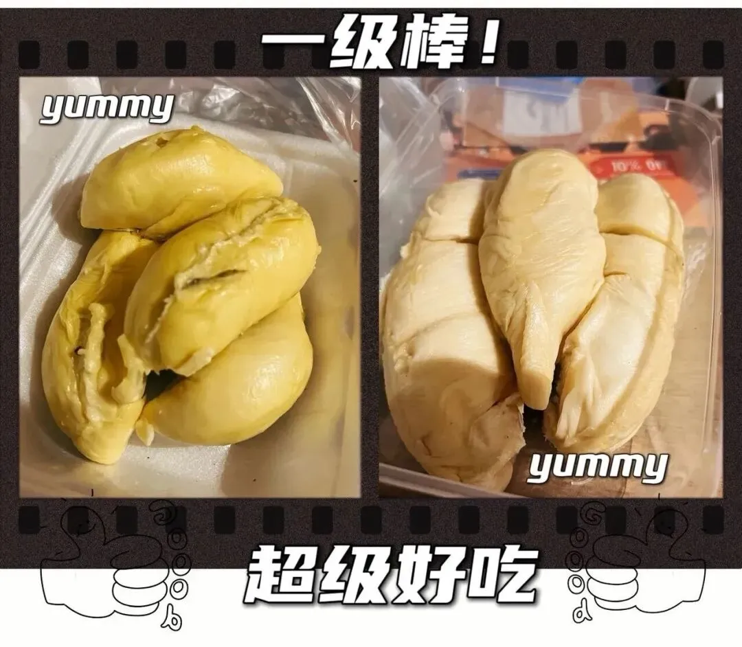 在夜市买了两种榴莲,一次必须买一整个‼️ 左边👈黄色的是黑刺榴莲,味道就是国内能吃到那种味道,味道👅很正宗! 右边👉白色的是本地8号榴莲国内吃不到,我尝起来感觉回味是有点苦,完全不习惯但是‼️我朋友就超级喜欢💕,我真的是震惊😱 深刻理解了那句话,萝卜青菜各有所爱!
