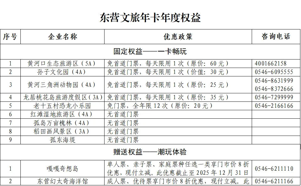 📌使用方法:在乐游东营文旅卡小程序使用权益优惠,在景区指定入口扫码入园,部分景区需凭身份证等证件换取纸质票。