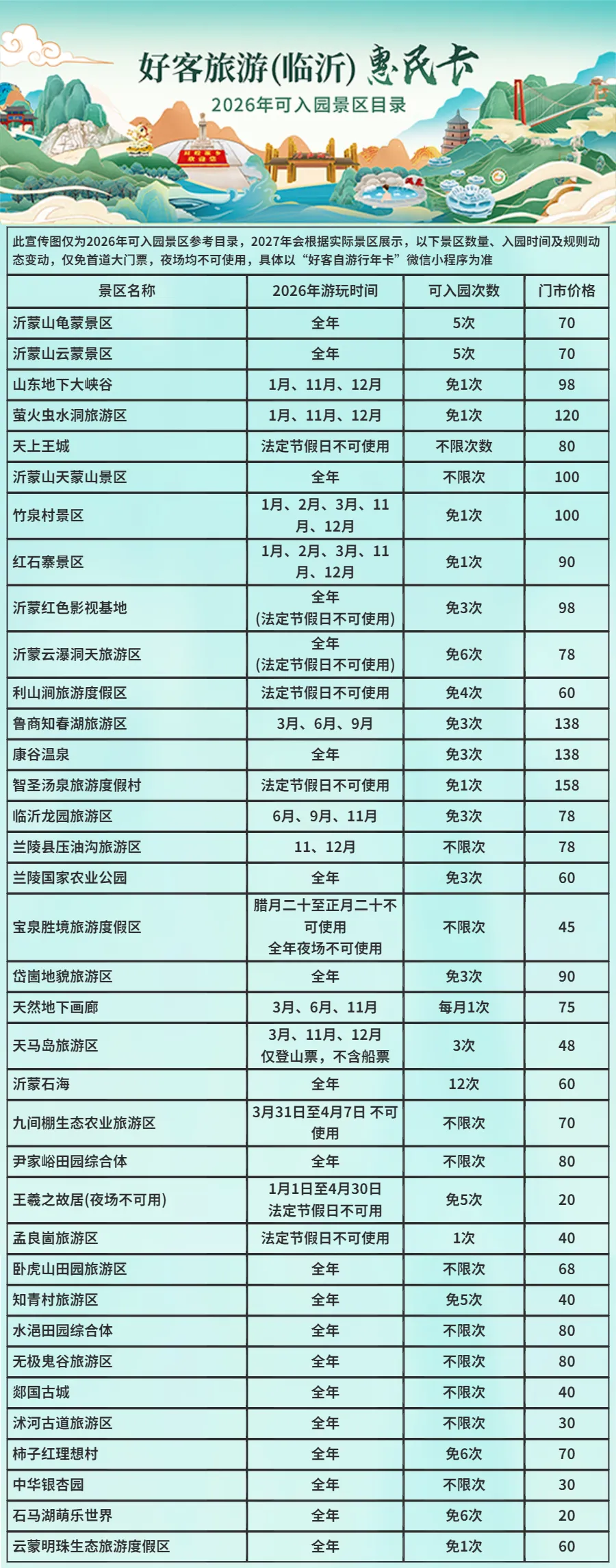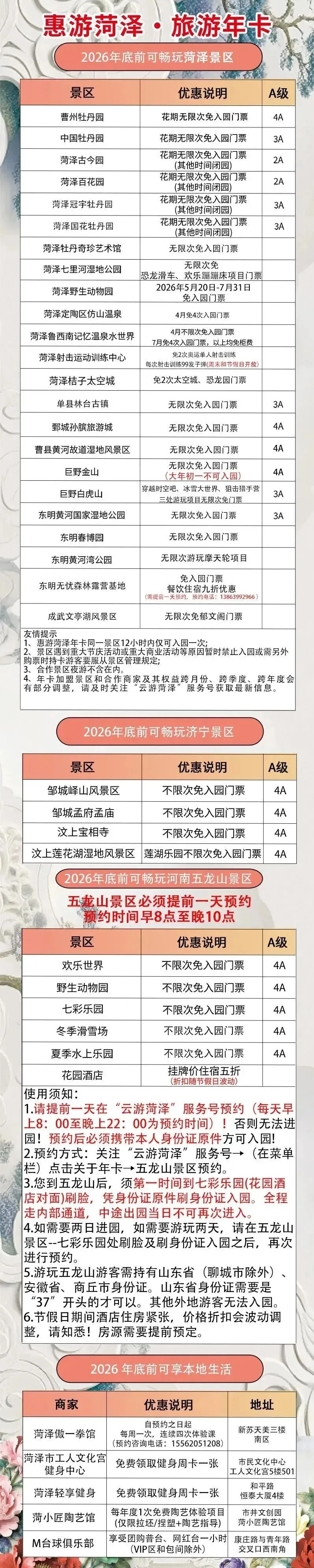 📌使用方法:开卡激活后扫码或刷脸使用,部分景区(河南五龙山景区)需在“云游菏泽”微信公众号预约
