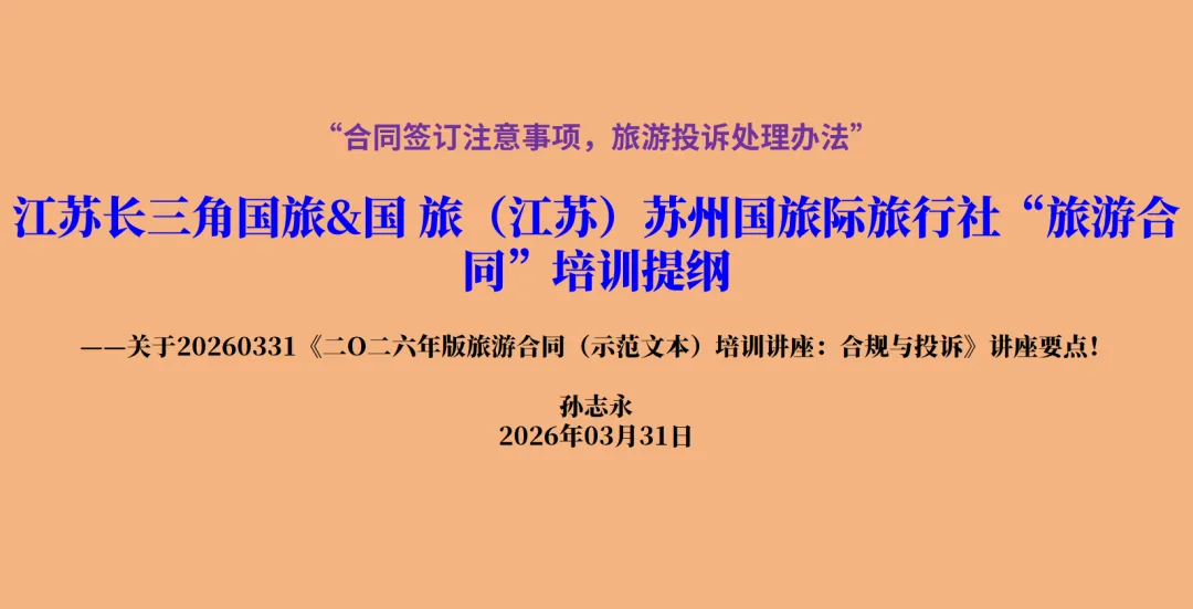 【旅游合同】“合同签订注意事项,旅游投诉处理办法”长三角&国旅(江苏)苏州国旅培训提纲——2026合同培训讲座:合规与投诉!