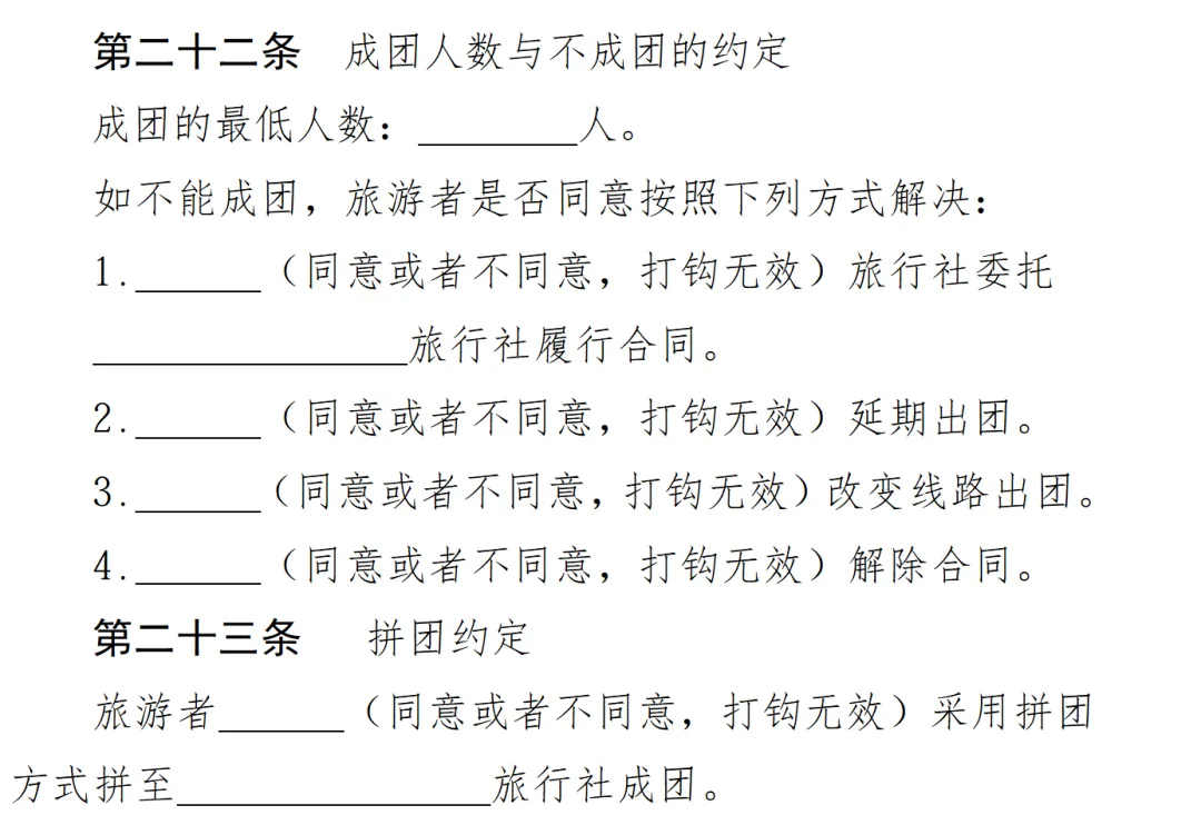 ⑦企事业单位团体游:第二十二条成团人数按双方约定补交通差等人数写,下面转团延期改线解除按实际情况写,整团交批发商填转给批发商,整团交地接社填不同意;第二十三条整团原则上应当写不同意,具体根据实际情况如果真的拼请如实写。