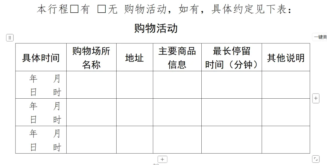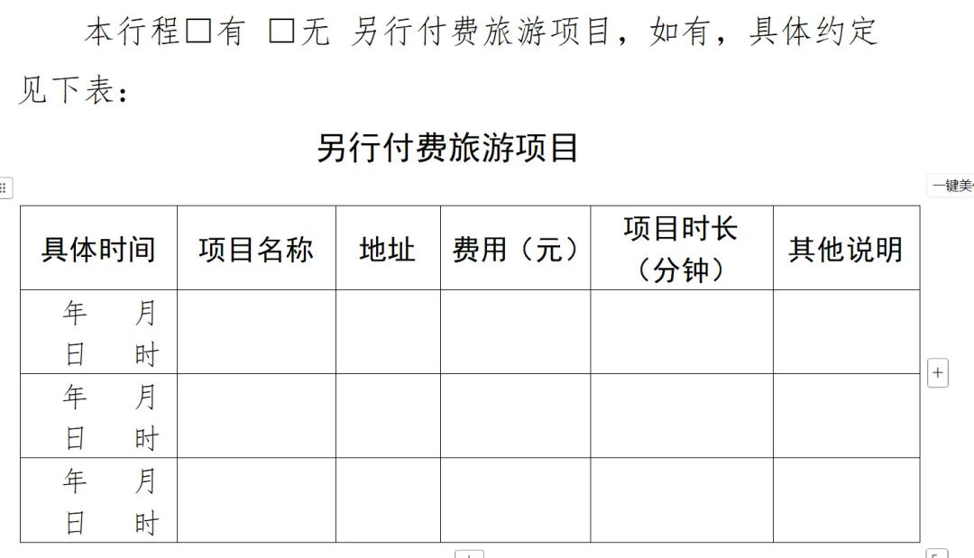 ①行程中有购物和自费的,要勾选有购物、有另行付费项目,并详细填写购物和自费的表格。