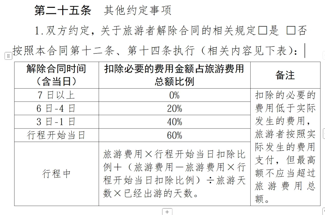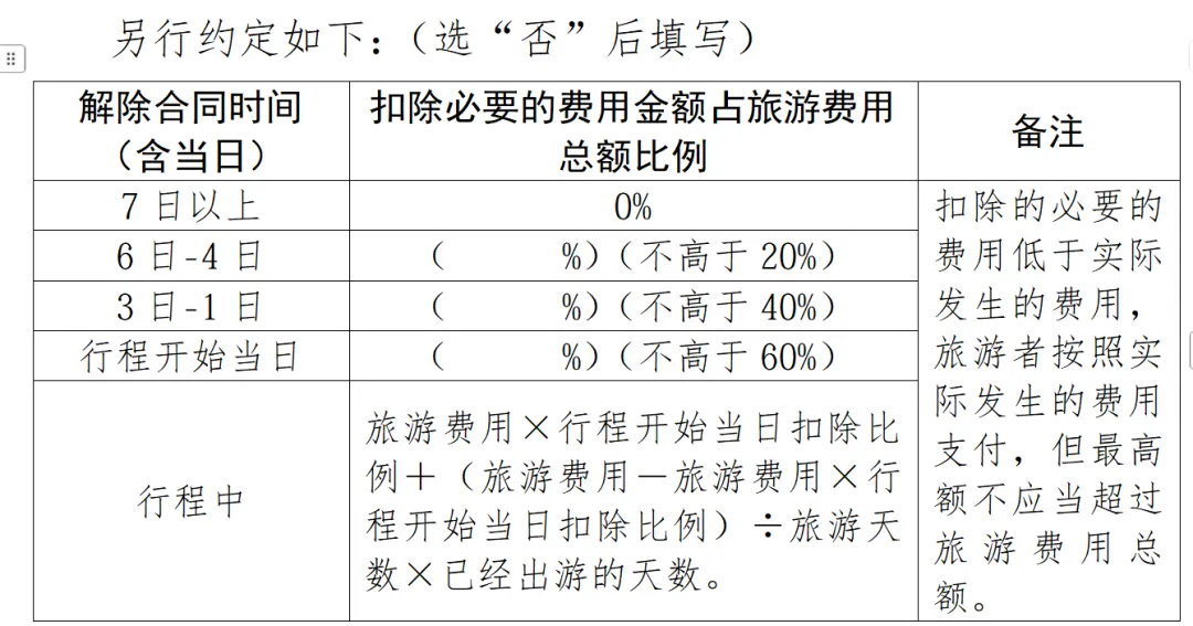 ③如果游客认为必发的费用扣除比例不合理,显失公平,可能会提请法庭撤销这个约定,判决标准是扣除比例与必要的费用计算是否在合理范围之内。