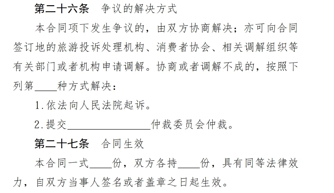 ②《旅游法》第六十条“旅行社委托其他旅行社代理销售包价旅游产品并与旅游者订立包价旅游合同的”没有通过示范文本予以体现。2026年版旅游合同存在天然缺陷。