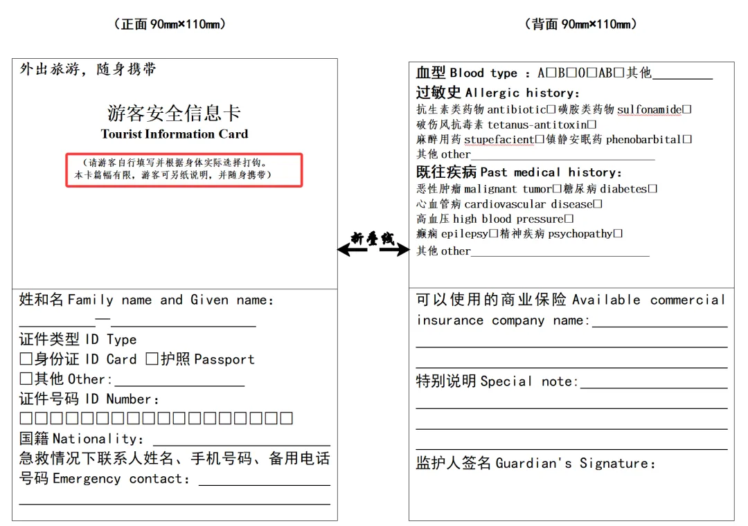 ③没有条件建议做成PDF通过微信发送给游客+提醒旅游者请自己填写一下随身携带以备不时之需。