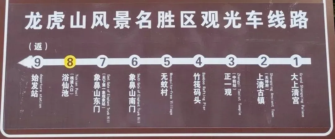 观光车行驶路线:观光车始发站—浴仙池(栈道入口)—象鼻山东门(观象台、栈道入口)—桃花洲(升棺表演)—无蚊村—竹筏码头 —正一观(中转站)—上清古镇(天师府、中转站)—大上清宫。要去上清古镇和大上清宫各要中转一次,图片为返程路线。