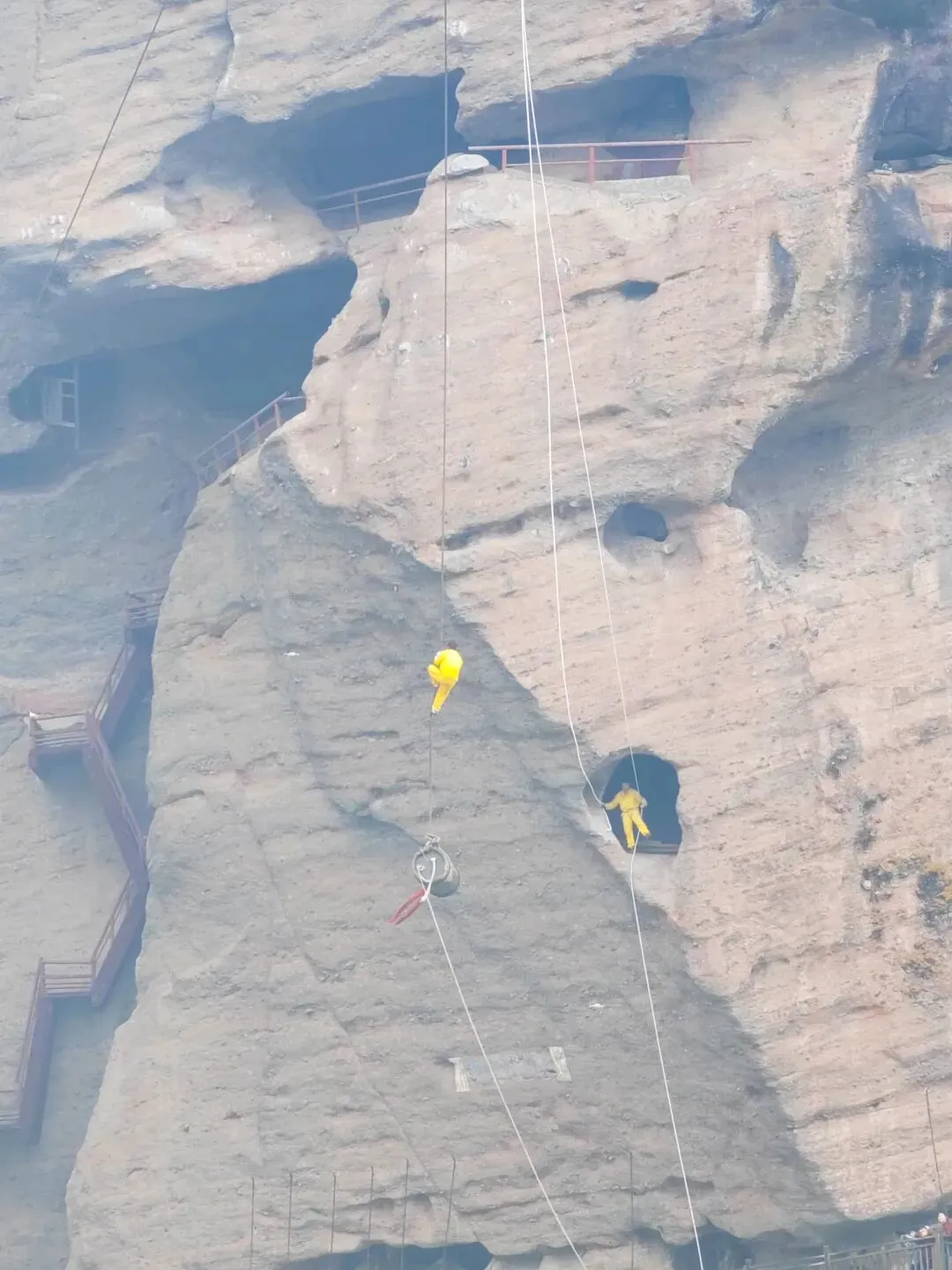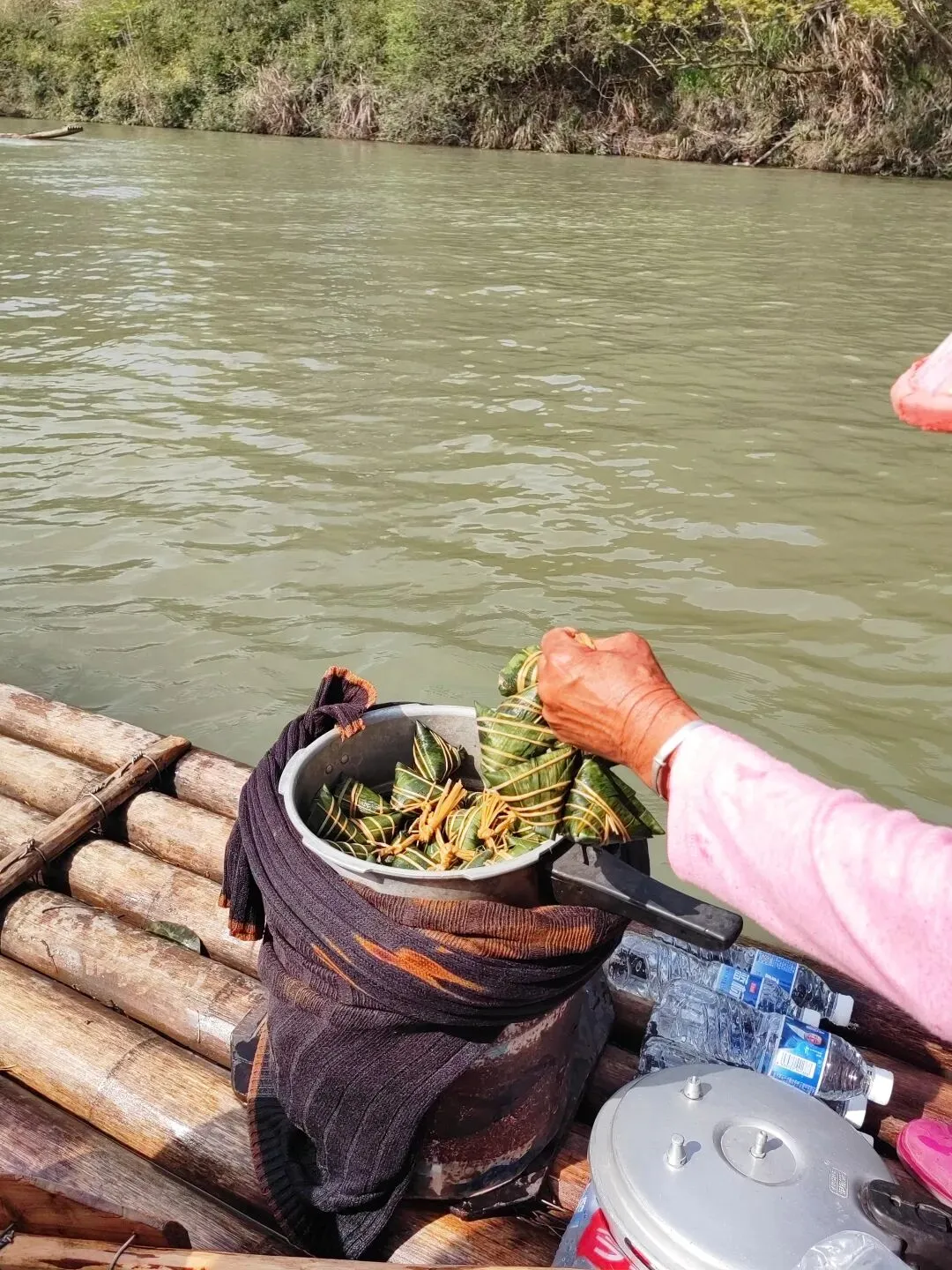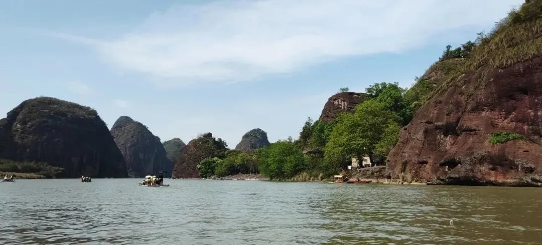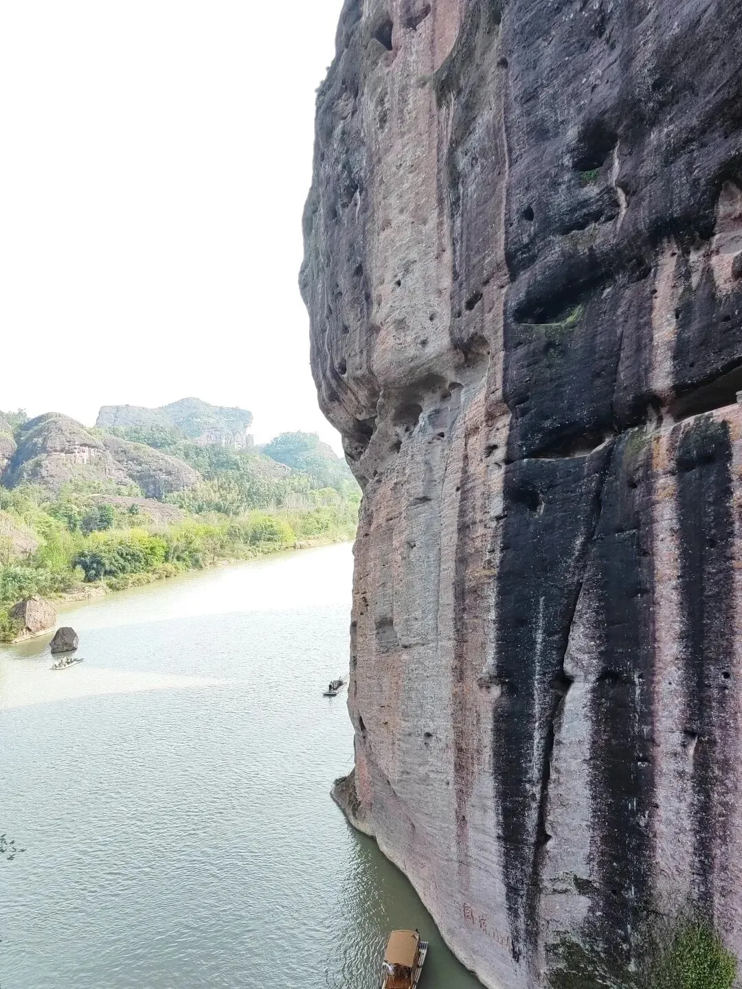 坐竹筏看两岸风景,有一点点桂林的感觉,不过之前一直下雨,水有点混浊。乘船过程中还有卖粽子的,5个打包卖,10元,刚开始她会说10个一起卖,和她谈一下就行。竹筏停泊点的悬崖上还保存着以前的悬棺。