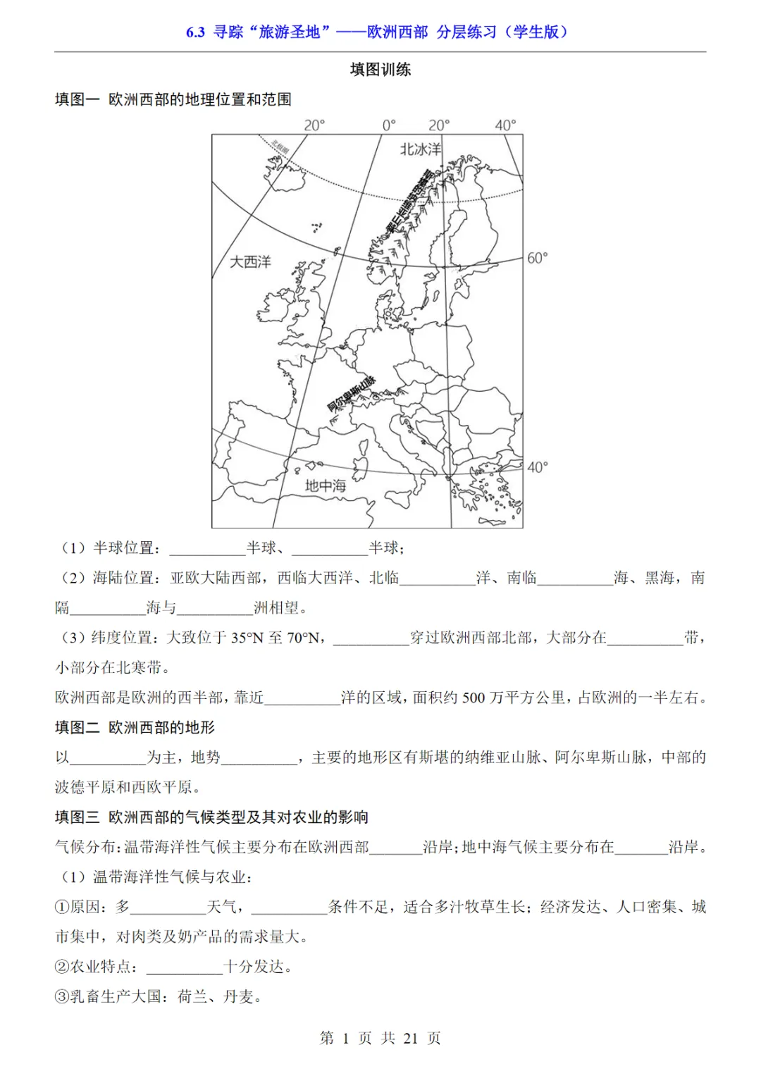 【免费下载】七年级(下)地理6.3寻踪“旅游圣地”——欧洲西部 分层练习(晋教版),电子版,可打印