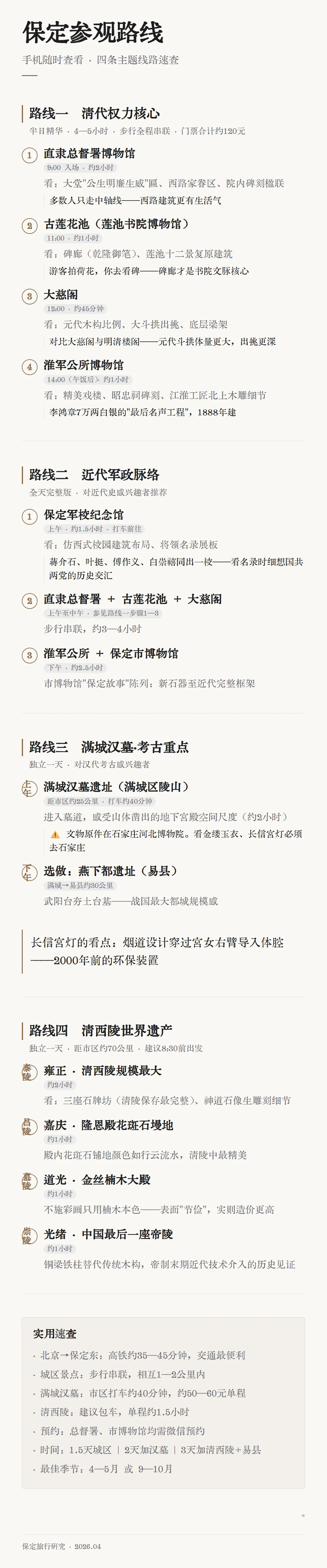 [[https://zhuanlan.zhihu.com/p/653480690][探访中国目前保留最完整的清代府衙——保定直隶总督署]] — 知乎深度游记,介绍直隶总督署建筑格局与历史脉络,有现场照片细节 [[https://zhuanlan.zhihu.com/p/783334864][满城汉墓探秘]] — 知乎文章,从考古视角讲满城汉墓发现过程与主要文物 [[https://zhuanlan.zhihu.com/p/1920522153780048770][保定市区8大博物馆保姆级攻略]] — 截至2025年全面更新的博物馆实用指南,含门票、预约信息 [[https://www.163.com/dy/article/IM59CKCE05199DKK.html][满城汉墓:王家的地下宫殿]] — 文博时空出品,考古专业视角,讲墓葬结构与主要文物 [[https://zhuanlan.zhihu.com/p/2020995463969555109][逛了淮军公所和总督署,我对李鸿章有了不一样的看法]] — 2026年新文,保定近代史人文视角