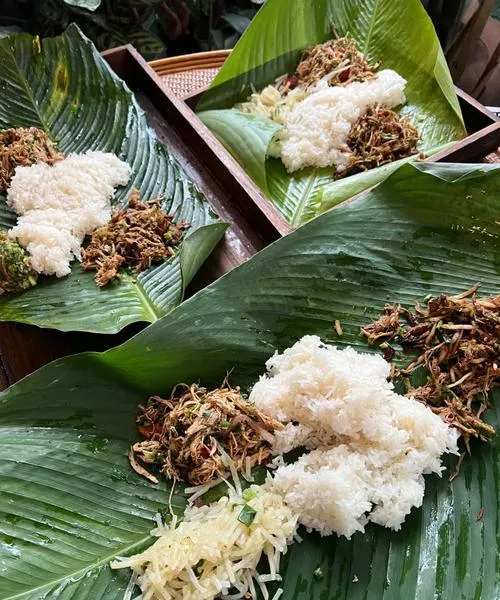 糯米饭是老挝的主食,用竹篓装着,吃的时候用手捏成团,蘸着各种酱吃,最常见的是辣椒酱和番茄酱,配烤鱼、烤肉、青木瓜沙拉,这一套下来就是标准的老挝餐,刚开始吃会觉得新鲜,吃几天就腻了,因为糯米饭真的很顶饱,而且有点粘牙。Laap是老挝的传统菜,碎肉拌香料,通常是猪肉或鸡肉,味道偏酸辣,配糯米饭吃,这道菜在老挝的地位相当于中国的家常炒菜,每家餐厅都有,但每家做出来味道都不太一样。