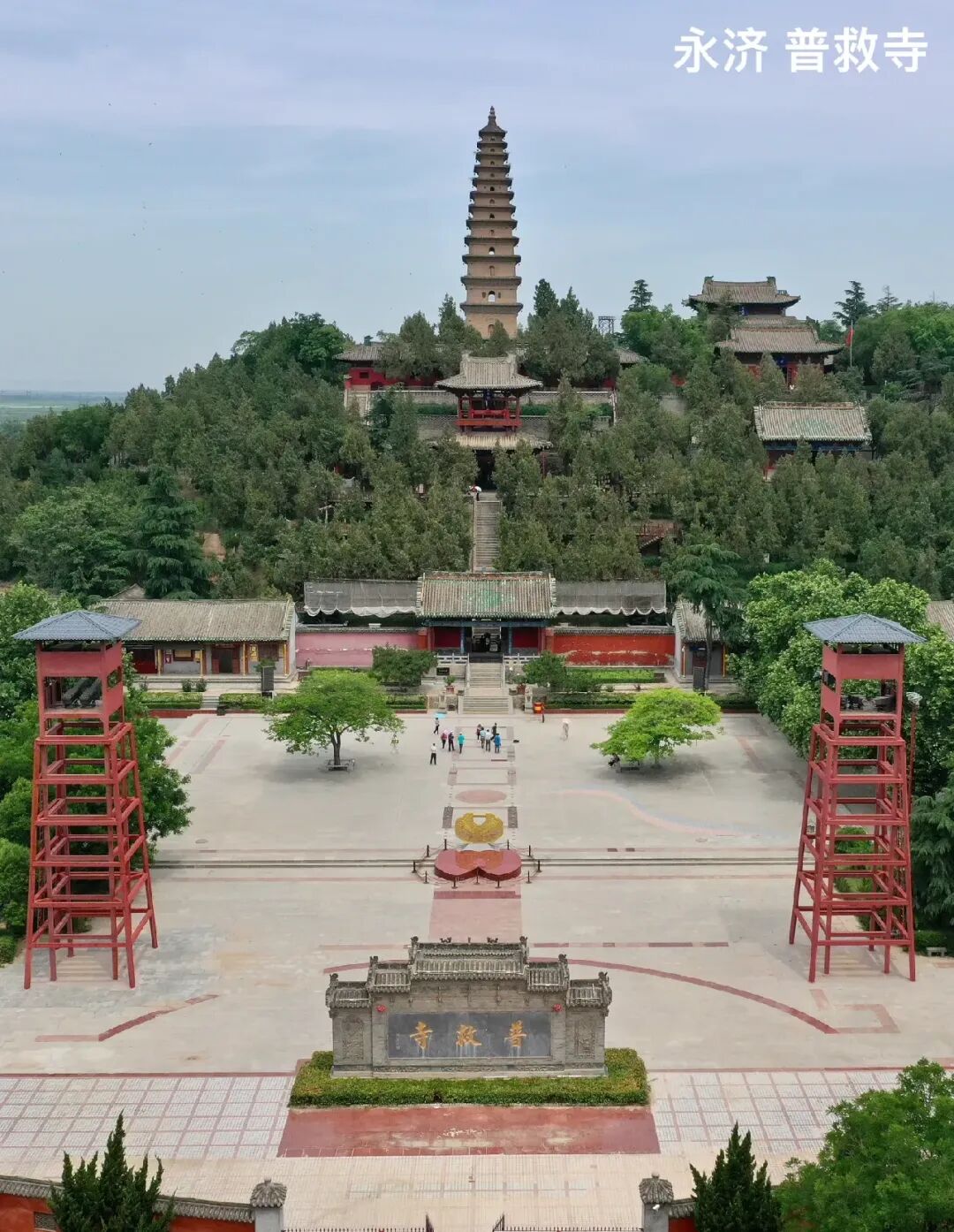 2. 永济:普救寺,黄河大铁牛,鹳鹊楼这三个景点在一条线上。普救寺门票60元,黄河大铁牛免费,鹳鹊楼门票54元,普救寺和鹳鹊楼我觉得门票太贵,不值[捂脸],所以没进去,飞无人机拍的,黄河大铁牛去看了,值得一看,关键还免费,佩服古人的智慧!