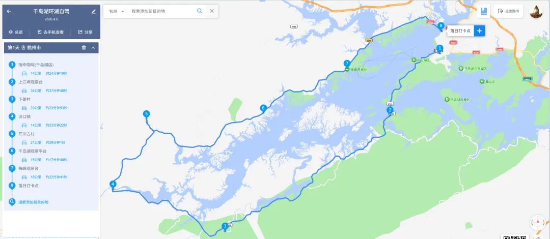 环湖路线上依次几个点是:上江埠观景台、下姜村、汾口镇、芹川古村、竹里村观景台、梅峰观景台、小金山观景台。