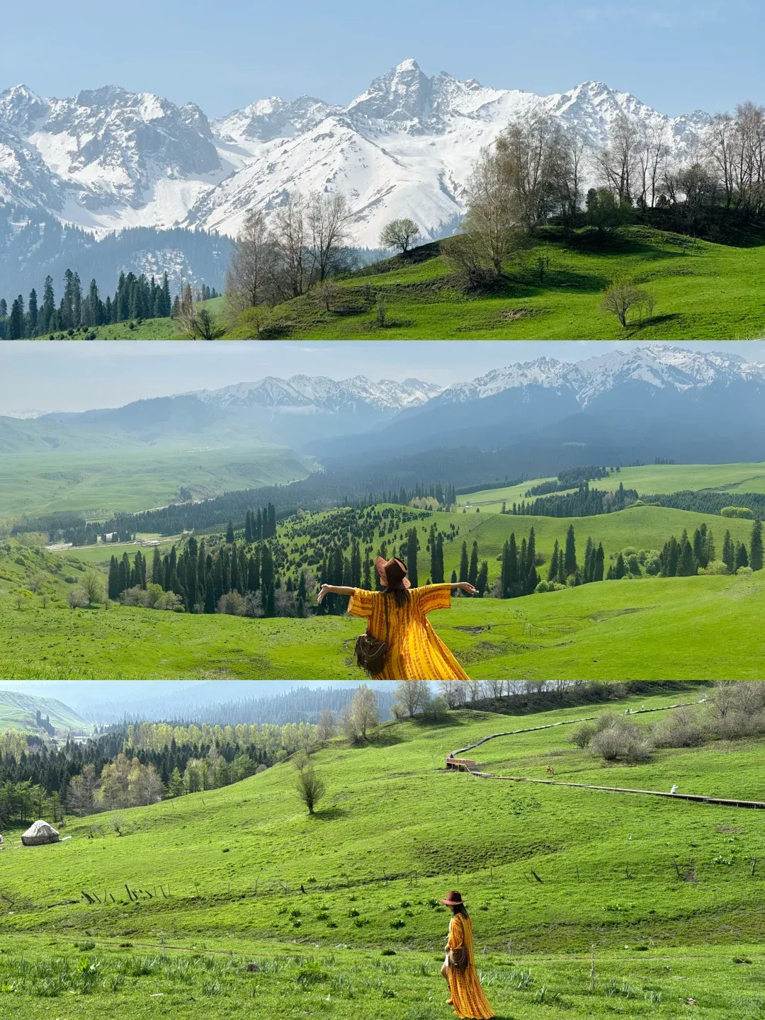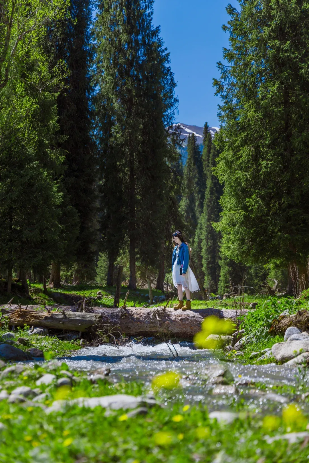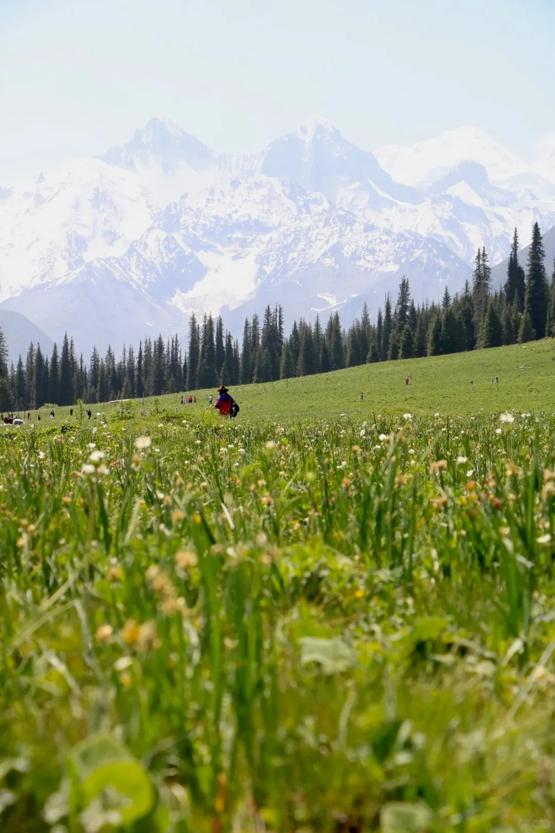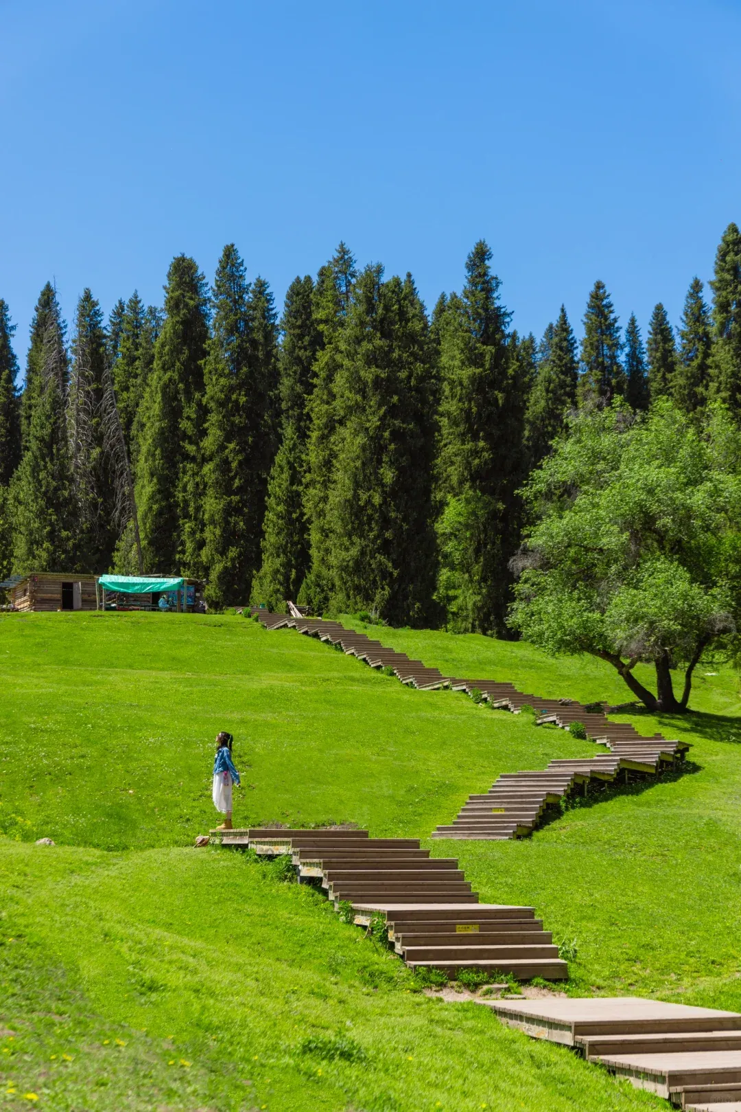 5. 库尔德宁 🌳 门票:60 元 + 区间车 48 元 开放时间:10:00-22:00 天山云杉的故乡,5 月雪山巍峨、云杉苍劲,草原嫩绿如毯,溪流叮咚穿林而过,森林、草原、雪山完美融合,既有雄奇壮阔的山野之美,又有温婉静谧的田园风光,徒步友好,氛围感拉满。 详细游玩攻略: 1.乘坐区间车直达喀班巴依峰观景台,俯瞰连绵云杉与草原,远眺雪山全景; 2. 走轻徒步线路(1.5-2 小时),穿行云杉林间,听溪流鸟鸣,拍森林光影大片; 3.打卡网红森林木栈道,背靠云杉、面向草原,拍原生态治愈系照片; 4.傍晚在观景台等日落,雪山染金、森林披霞,绝美又震撼。 避坑指南: ✅ 区间车必坐,景区面积大,步行不现实 ✅ 不采摘野花,保护植被