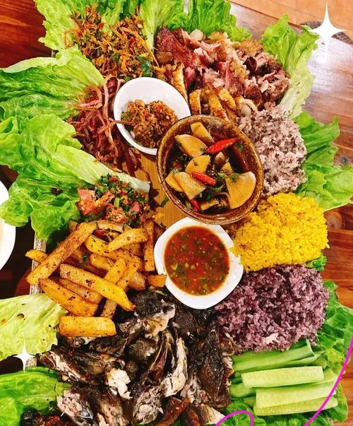 还有个撒撇,这是傣族的吃法,把牛苦肠里的消化液挤出来,加上各种香料和生牛肉,拌匀了蘸着吃。很多人听到这个做法就怕了,觉得又苦又腥,但你真吃到嘴里会发现,那个苦是清苦,那个腥是草腥,两种味道混在一起反而把牛肉的鲜味托得特别高。这种吃法讲究的不是好不好接受,讲究的是食材的完整性,就是一头牛,从肉到内脏到消化液,全都不浪费,全都物尽其用,这背后藏着的是这个民族对自然的理解方式。
