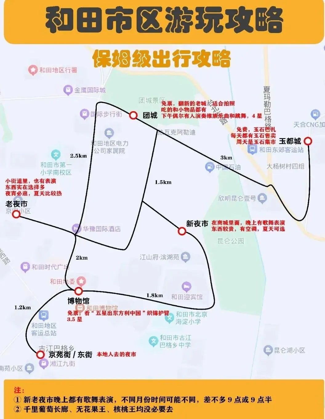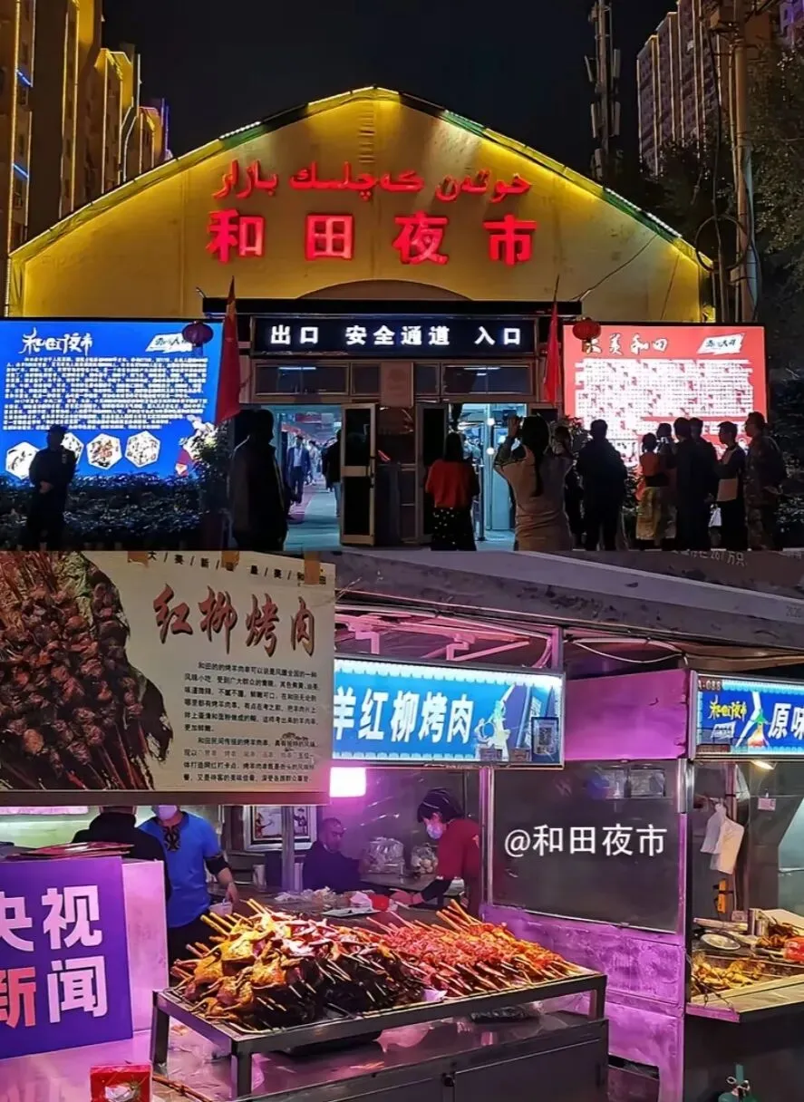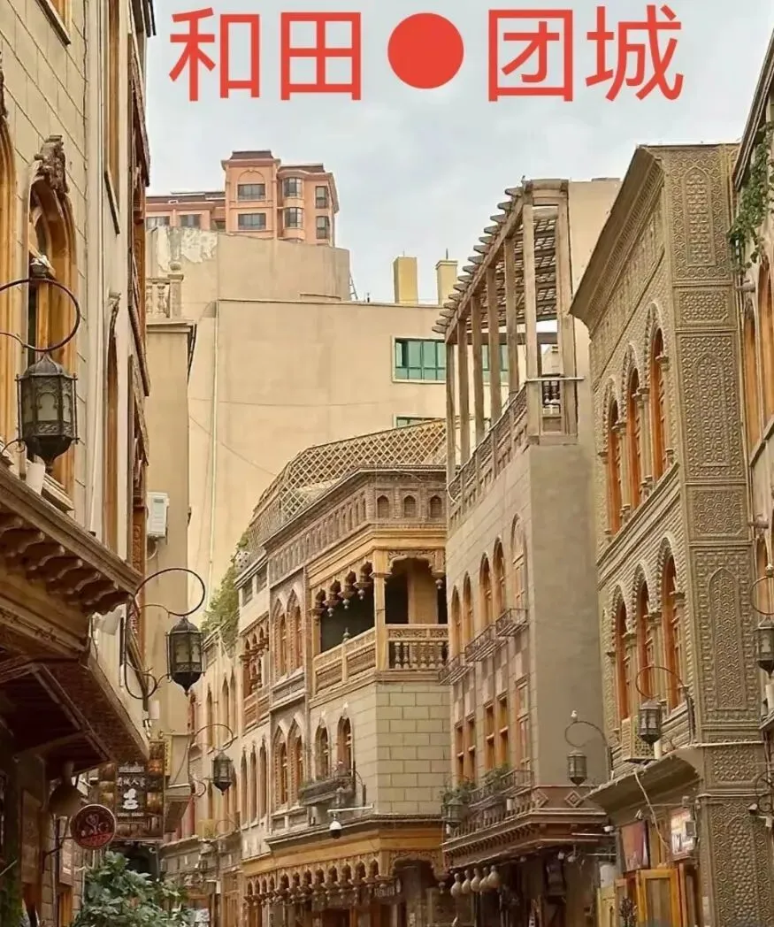 感受新疆当地建筑特色,整片整片的奶油色街巷,随手拍都是大片背景墙。喜欢拍照的一定要来这里,在这里生活太安逸了。晚上还能看到表演,一天游玩结束,打车前往和田夜市,