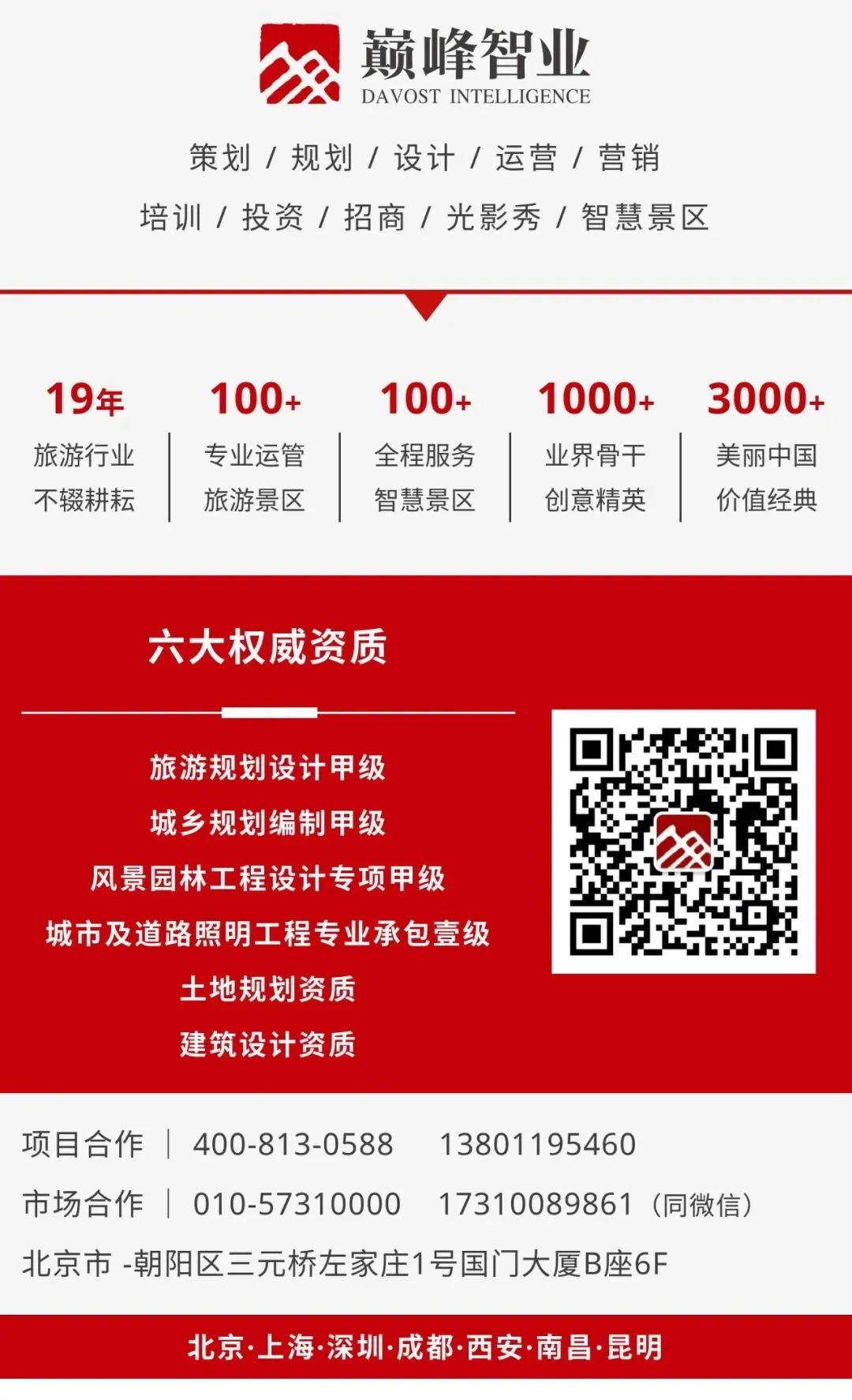 北京巅峰智业旅游文化创意股份有限公司始创于2001 年,公司秉承“美丽中国·巅峰智造”的使命,是中国旅游规划行业的标杆企业、文旅产业创新引领者,提出了 “策划规划、产品建设、落地运营、营销执行”四位一体全链服务战略,为客户提供文旅产业创新发展线上线下一站式解决方案。
