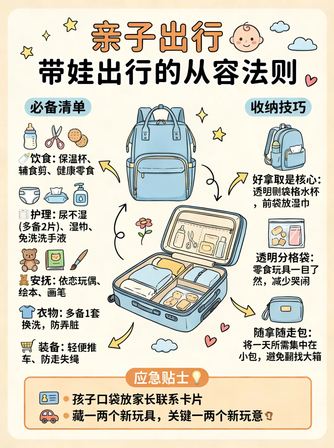 收纳技巧: 不要将儿童用品压在箱底。使用透明的分格袋装零食和玩具,让孩子一眼看到。将一天所需的物品集中放在一个小包里,实现“随拿随走”。