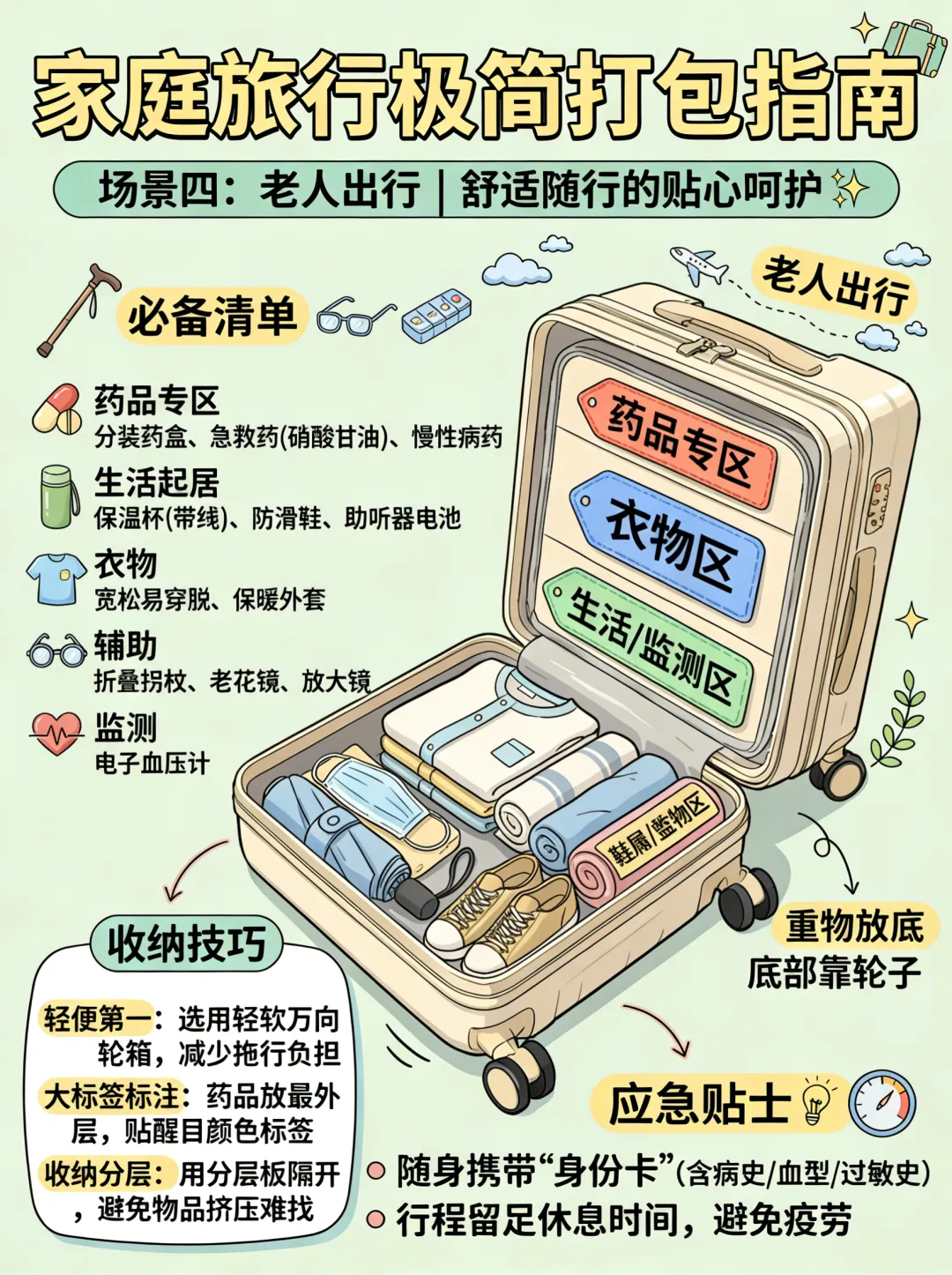 收纳技巧: 选择轻软的万向轮箱,减少老人拖行负担。药品必须放置在最外层的口袋或随身包中,并用大标签清晰标注。为每件重要物品贴上醒目的颜色标签,方便老人辨识。